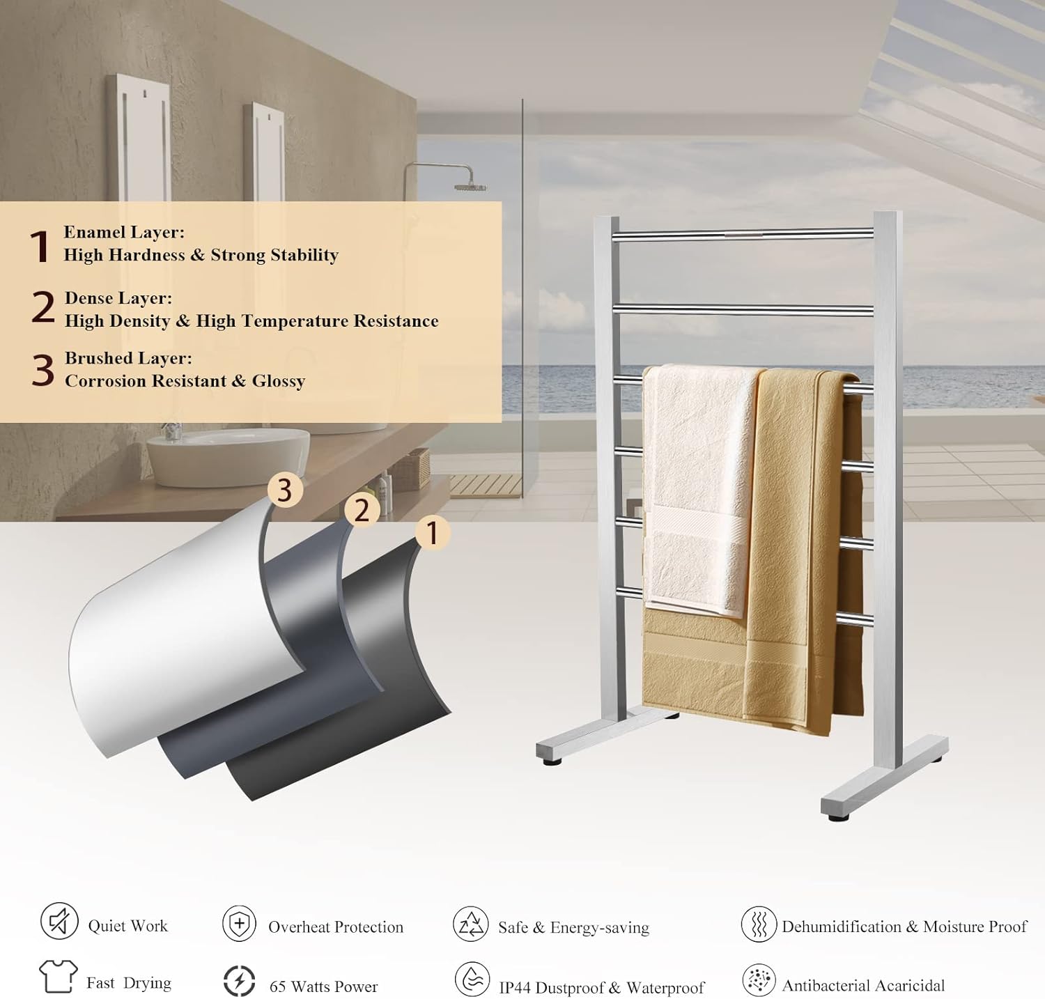 ENERGY-SAVING & SPACE-SAVINGThe SHARNDY towel heater comes with very low consumption rates so you don`t have to worry about paying too much for electricity. Use electric to produce zero pollution and an economical 65W heat output costs less, an affordable alternative to traditional dryers. Freestanding design saves space, and it can be used in almost any room with a functioning outlet and easily moved to different locations. Not only a perfect towel heater, but also a wonderful decoration.