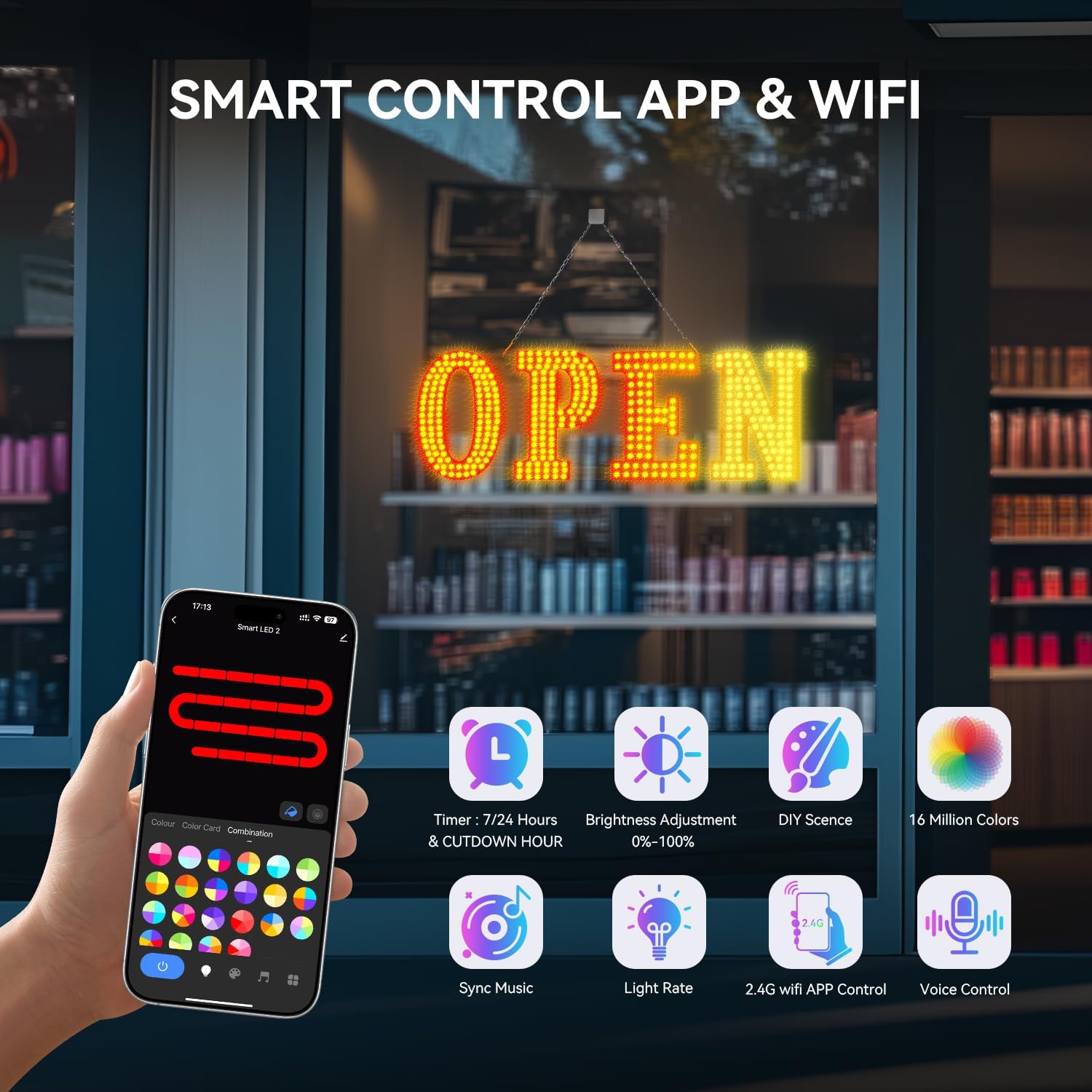 Smart APP Control: Using APP and a customizable app, change the color, flashing mode, and speed to suit your brand’s style or create the perfect atmosphere for your store. A smart open sign that fits your business needs.