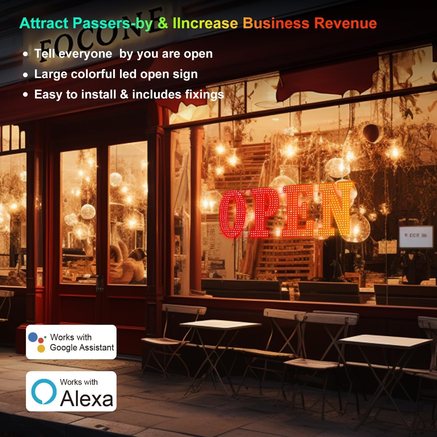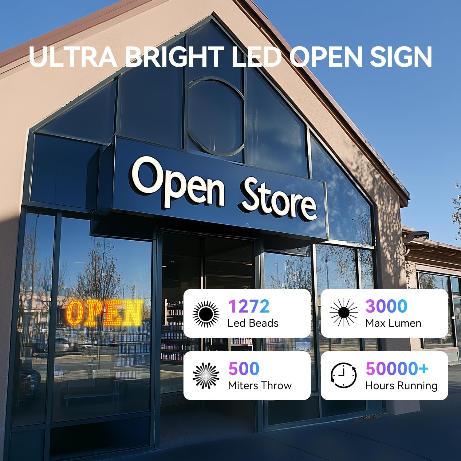 Jumbo Open Sign: With a massive 48\'x16\' display, this LED open sign is designed to be seen from even further away. It’s impossible to miss, making it perfect for larger storefronts in suburban areas.