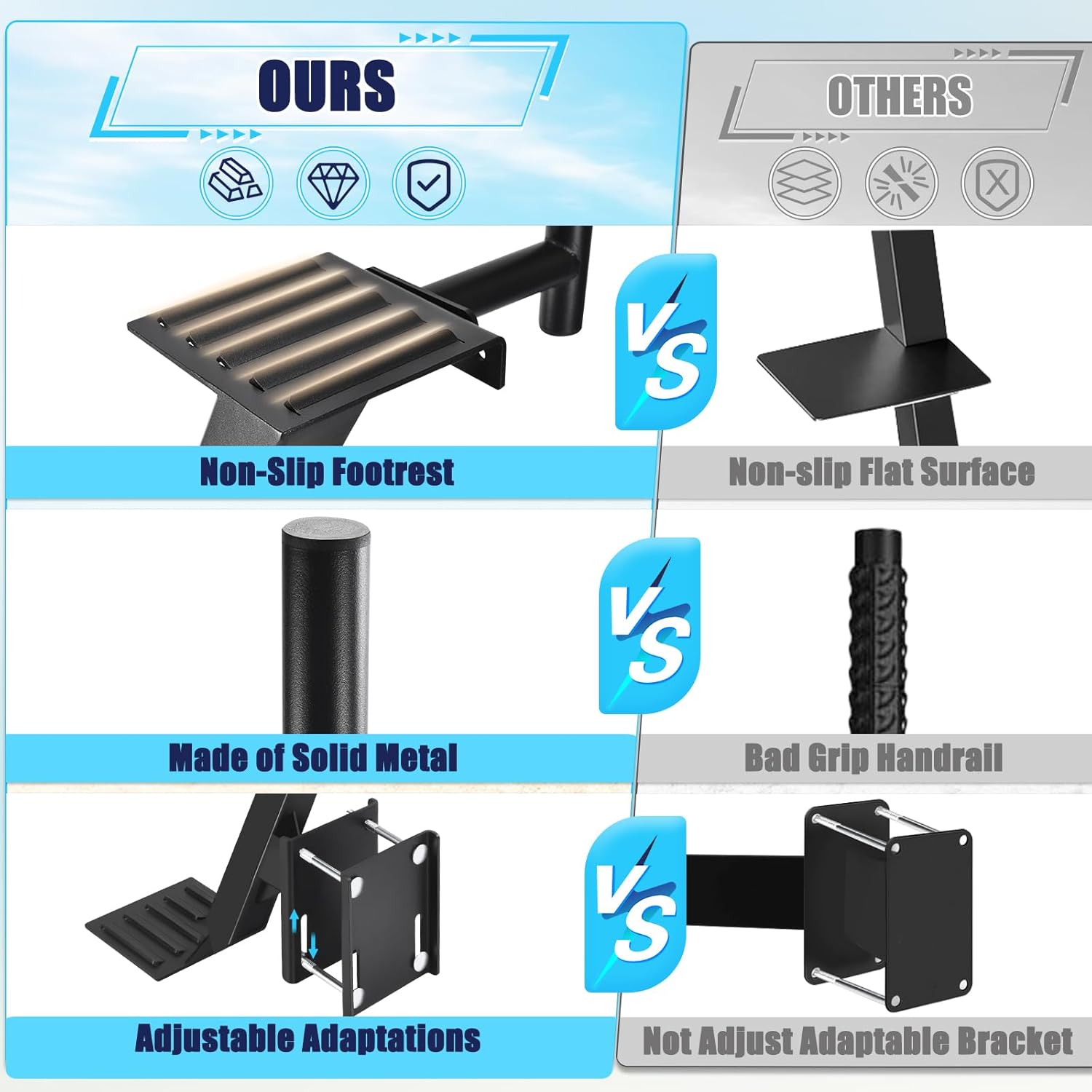 Anti-Slip Step DesignThis step mount is constructed entirely from durable metal. The stepping platform features a robust, evenly patterned incline with raised ridges to enhance grip and improve traction with the sole of the foot. This ensures secure footing, reducing the risk of slips and falls for safer use.