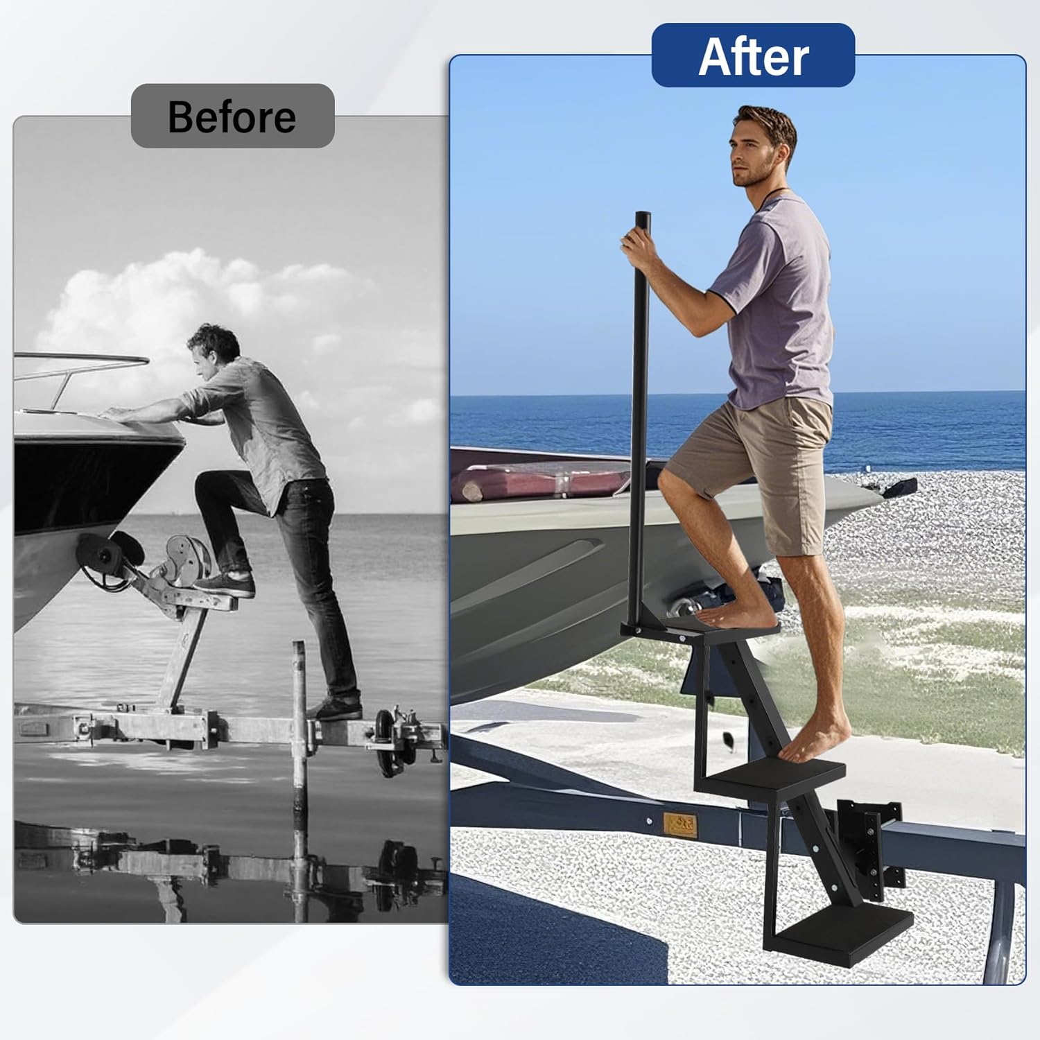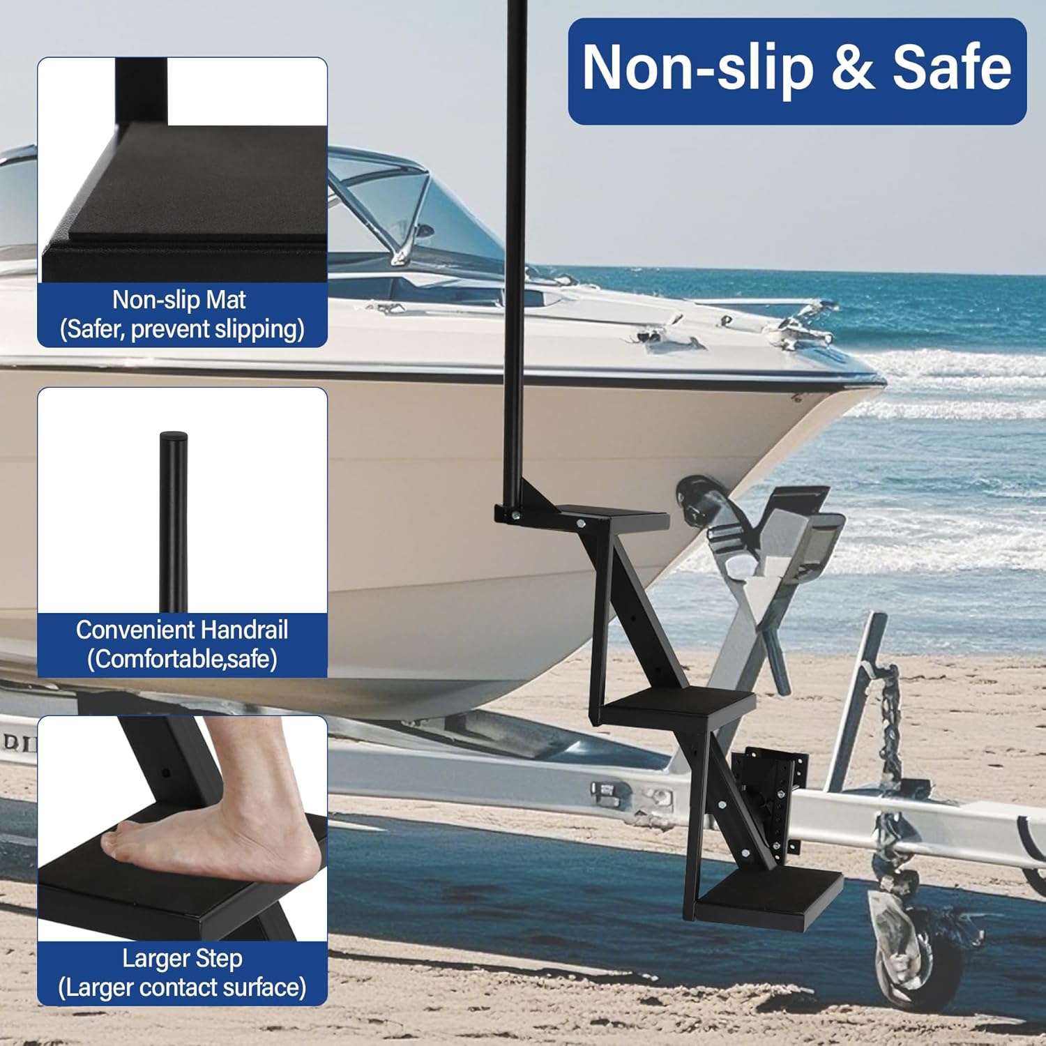 Non-Slip & Safe Access: The boat trailer steps for the tongue are equipped with non-slip mats and a handrail to reduce the risk of slipping when getting in and out of your boat; In addition, each step size is 7.1\' x 11.8\', providing a larger foothold, ensuring safety and comfort