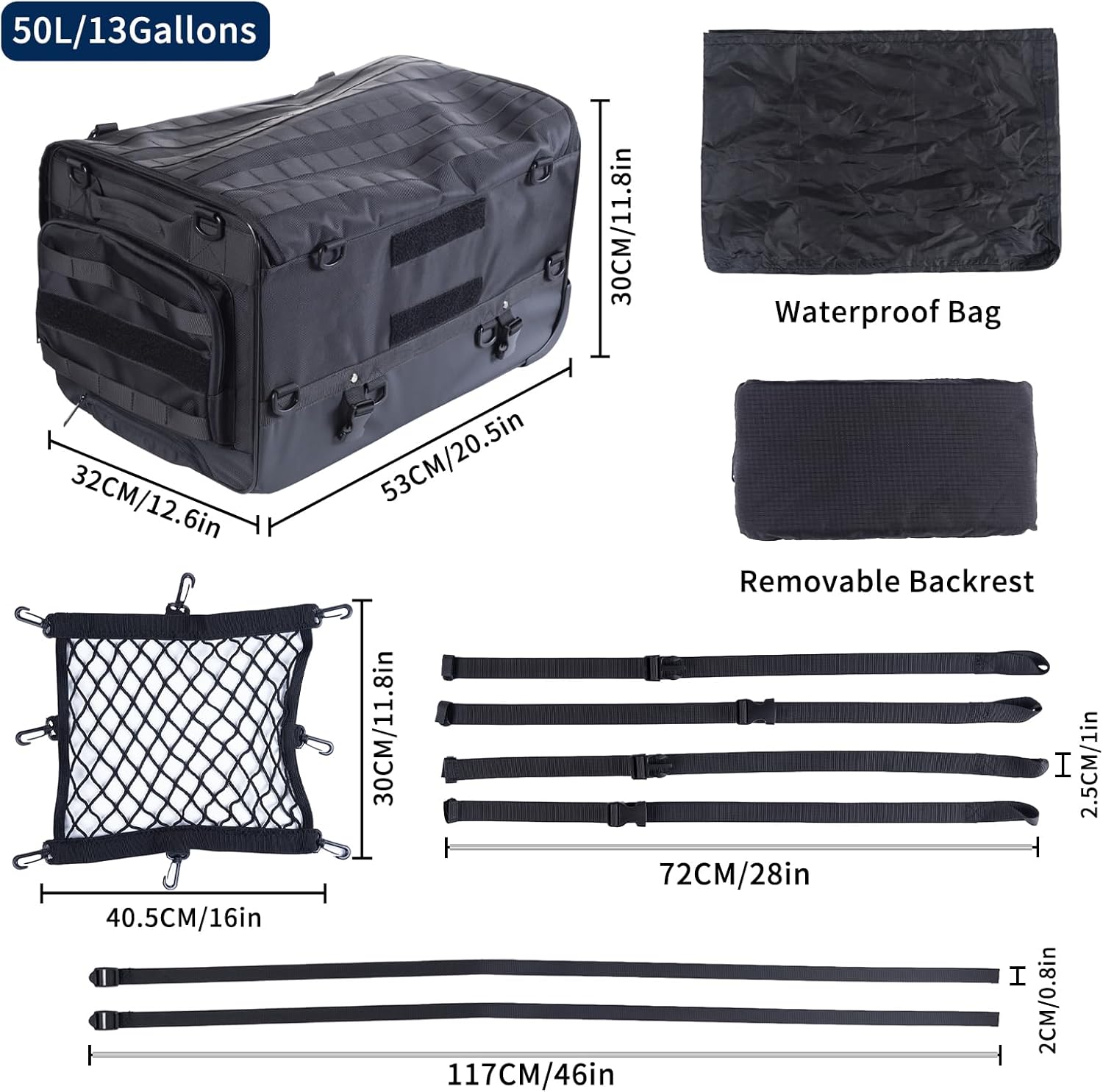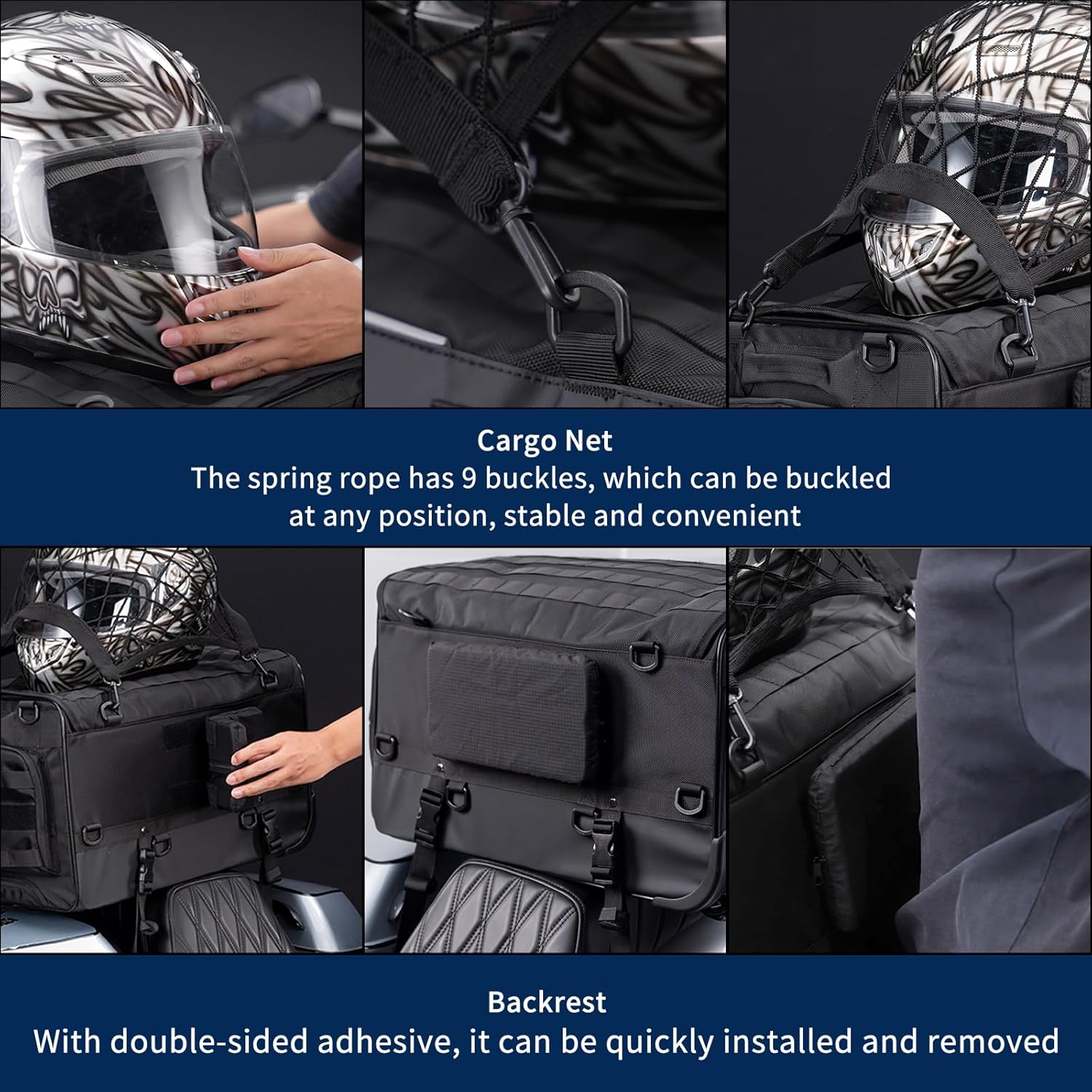Cargo Net and Backrest: Innovative design, the backrest is fixed by hook-and-loop fastener, and can be installed and removed according to needs, providing a more comfortable driving experience for long-distance travel. The elastic net bag can be used to put a full-face helmet, and can also be customized to fix additional luggage, making it more convenient to check in more luggage.
