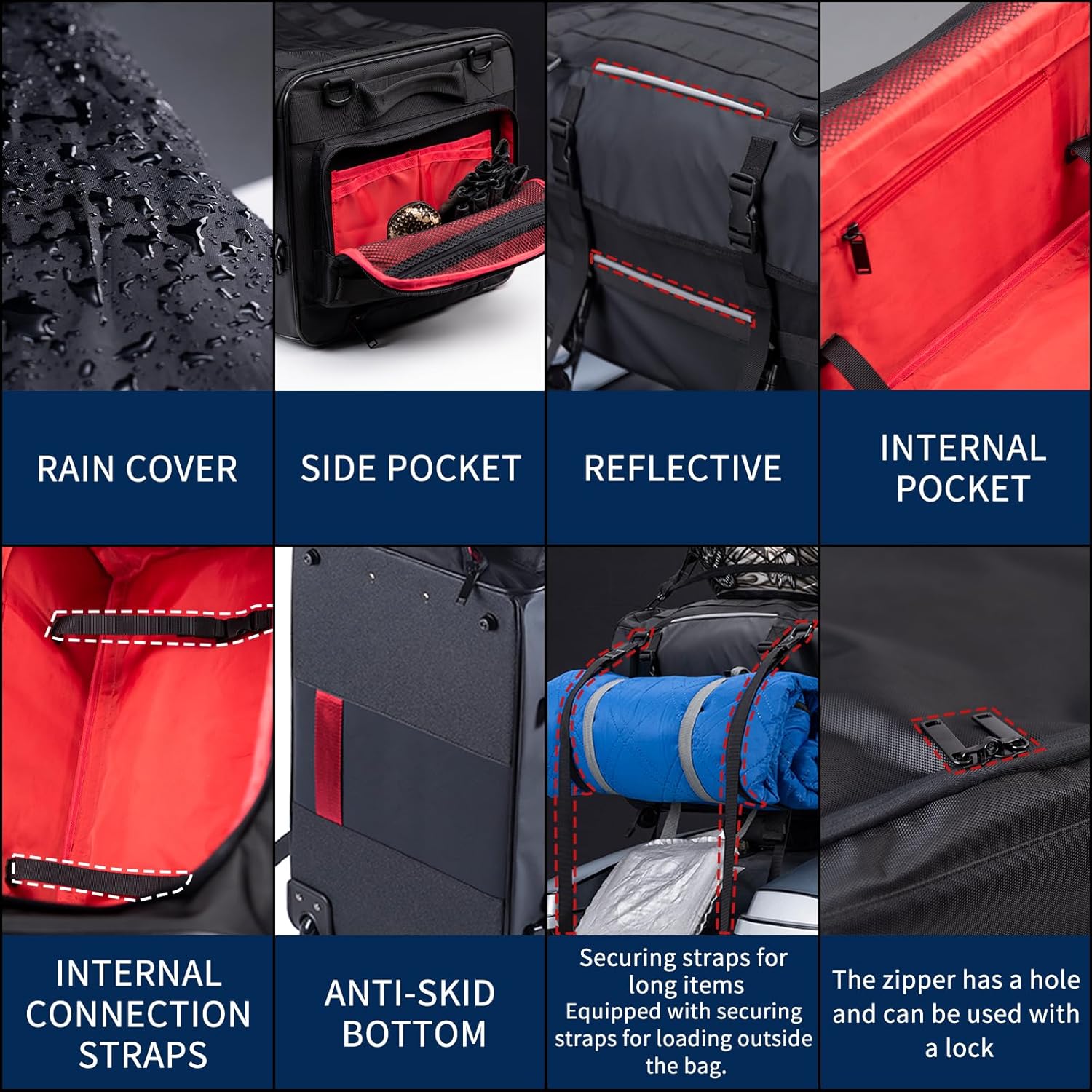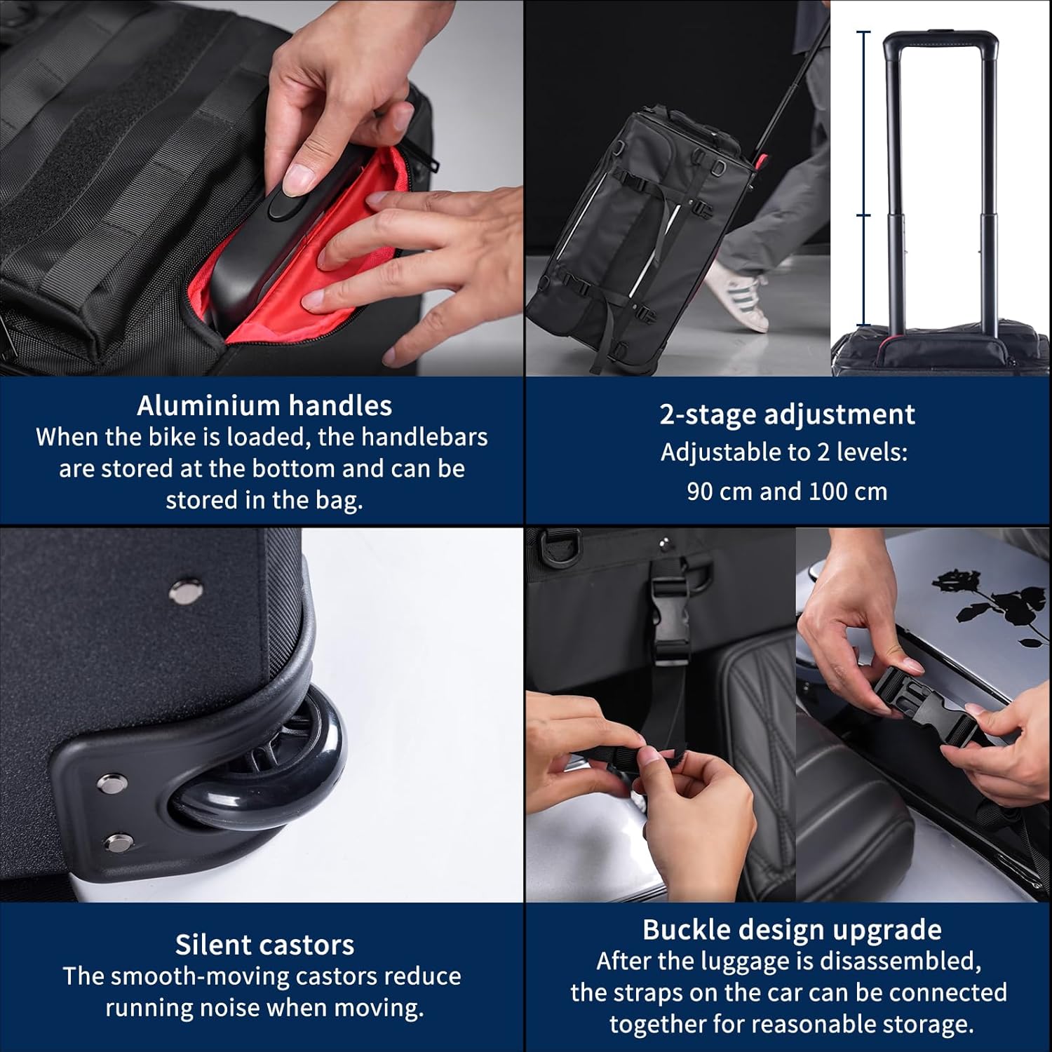 Hidden retractable handle and Smooth, Silent Casters: The motorcycle tail bag adopts a unique design, which is easy to unload from the bick and offers unmatched convenience for riders. No more carrying heavy luggage—simply roll it away!