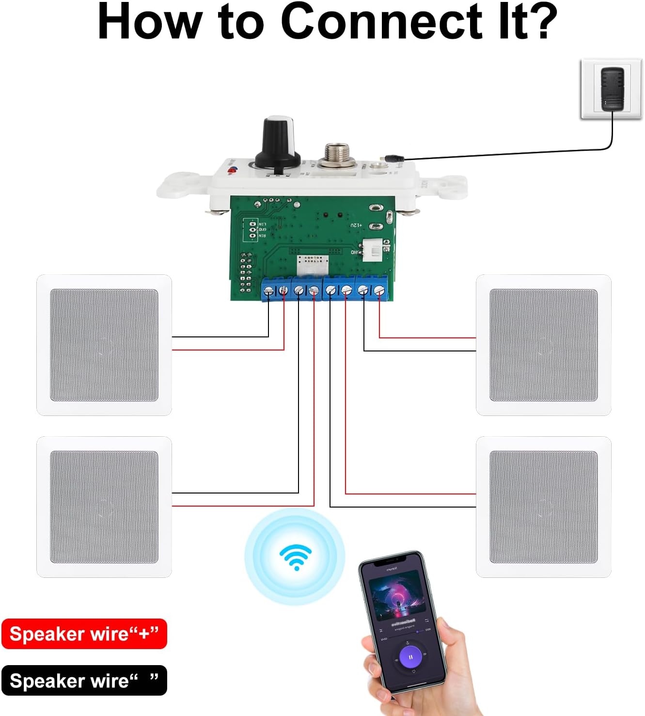BLUETOOTH CEILING SPEAKERS STEREO SOUND SYSTEM Independent 4 channel in wall Bluetooth amplifier bring you stereo sound effects, wireless connection Range: 30` ft (10M). The in wall amplifier allows you to stream music to a connected intercom or speaker system hassle free. An elegant fusion of technology and aesthetics designed to infuse your every corner with seamless music, redefining audio experiences in homes and offices alike