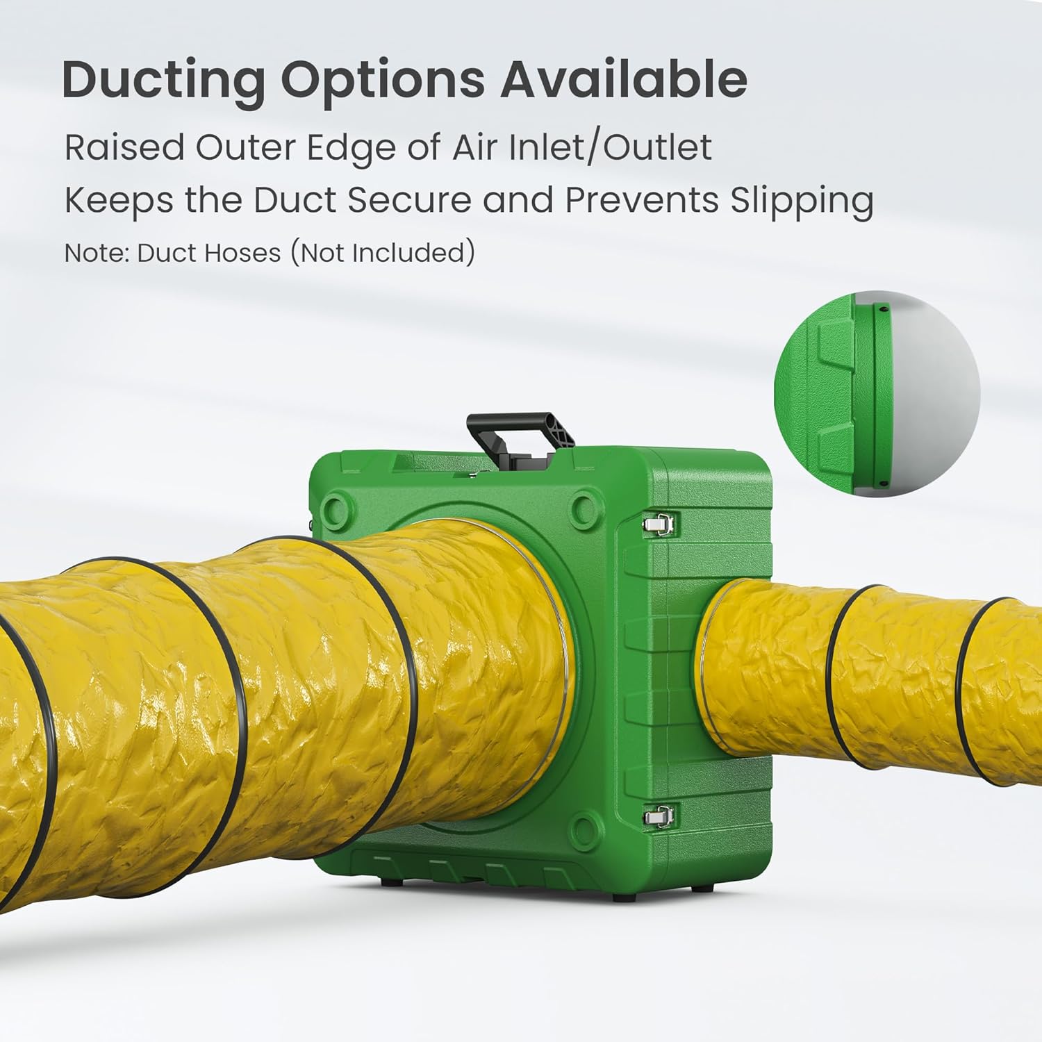 Durable Rotationally Molded Polyethylene (LLDPE) Shell: This air scrubber features a rotationally molded shell that is highly durable, wear-resistant, and able to withstand extremely harsh environments. This air scrubber is perfect for applications such as wall painting, construction sites, sewer repairs, home repairs, water and fire damage restoration, wildfire, factory, restaurants, offices, toilets, pet shops, and printing factories, etc.