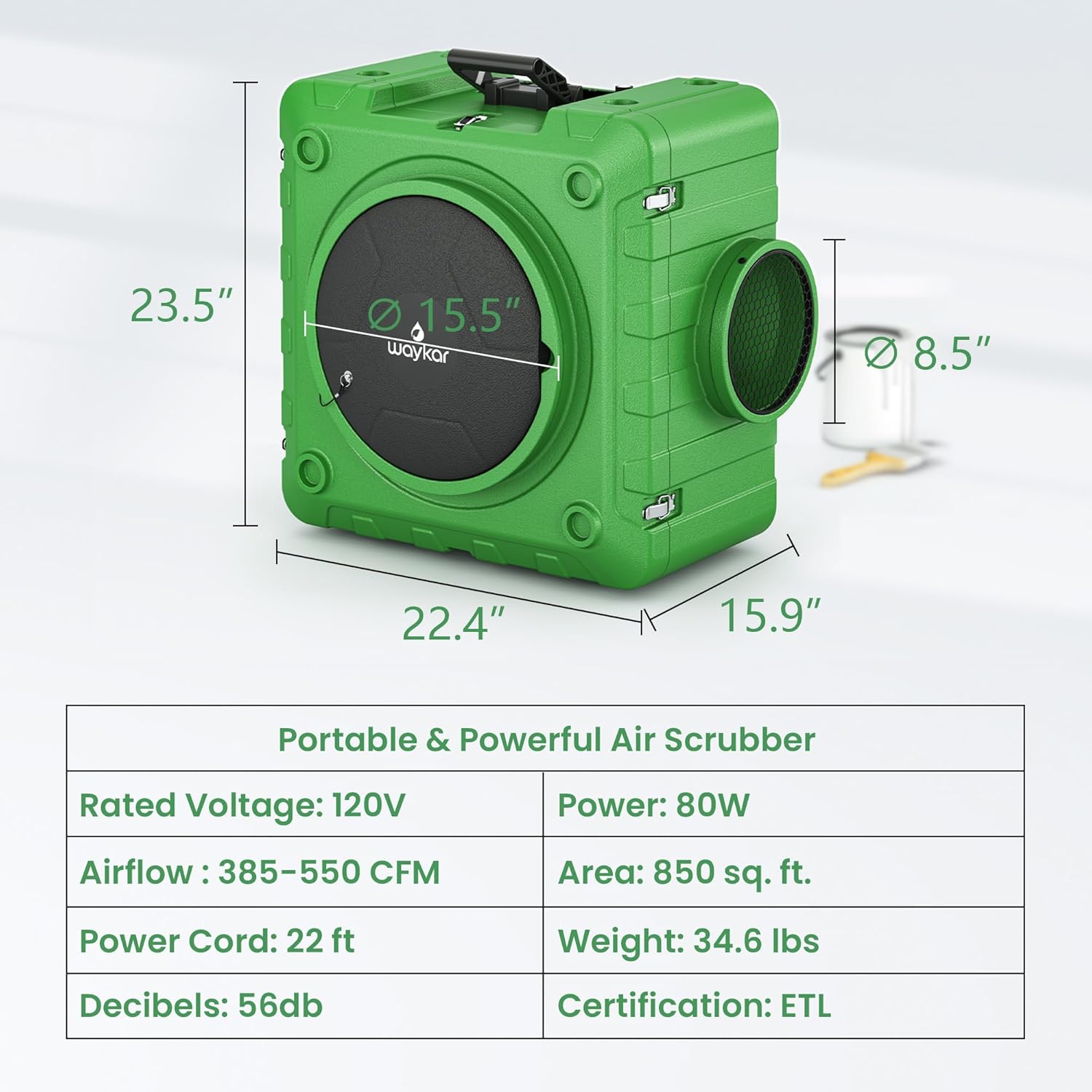 The Ultra-High Airflow is Suitable for Large Areas: This air Scrubber features an ultra-high airflow of 550 CFM (Adjustable Speed 385-550 CFM) , making it suitable for spaces of 850 square feet and 6600 cubic feet. It also comes with short-circuit protection, including a circuit breaker switch that cuts off power to the device when the current exceeds 12 A, ensuring protection for the equipment.