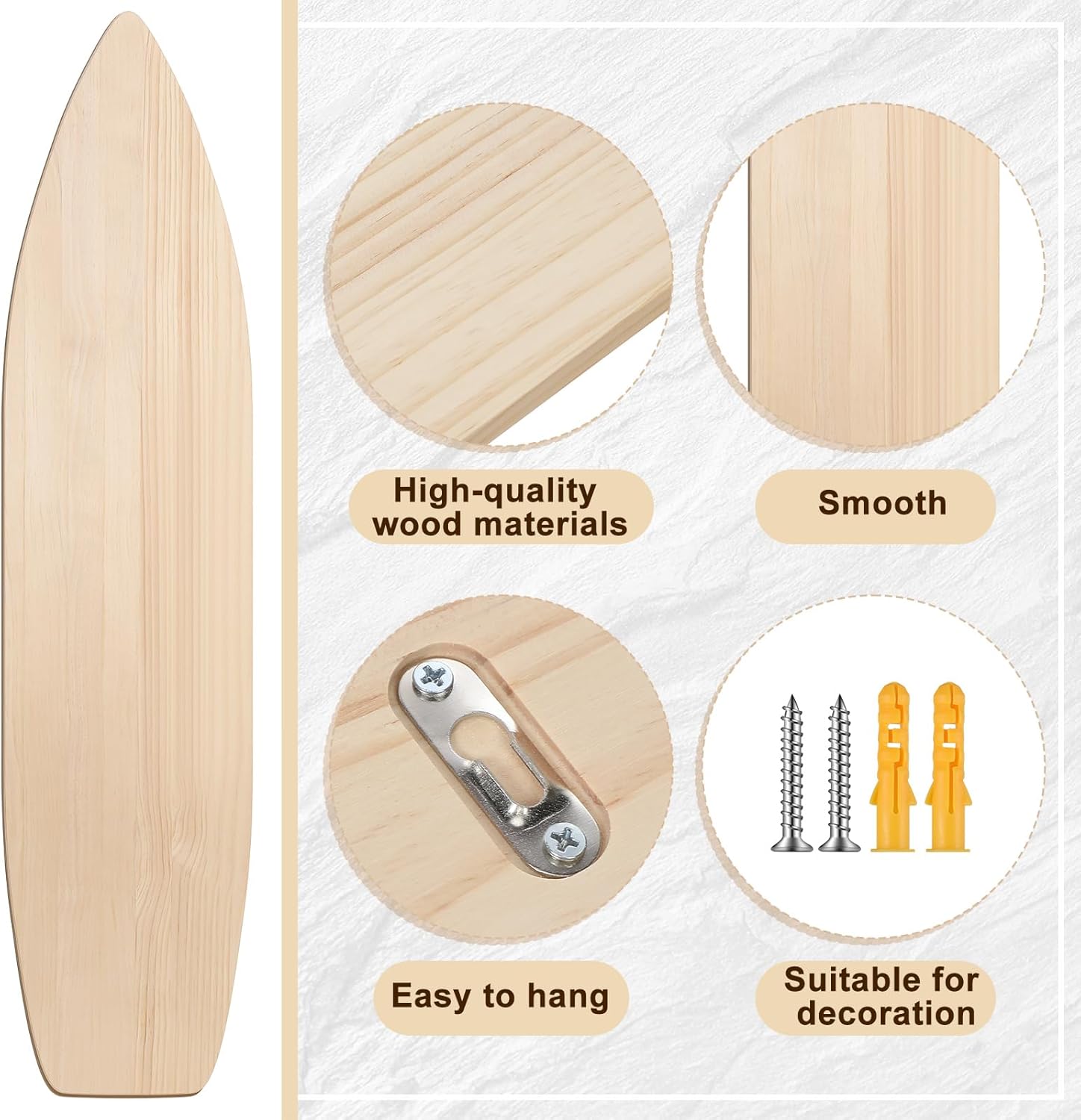 Quality Material: the decorative surfboard for the wall is 3/5\' pine wood, this pine material makes the product more durable and less prone to breakage, and can maintain its integrity over many years; Since the product is natural wood, the grain will from board to board, so if you want your board to have the look of natural wood, you can just hang it