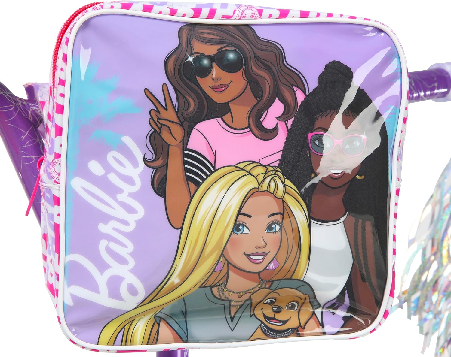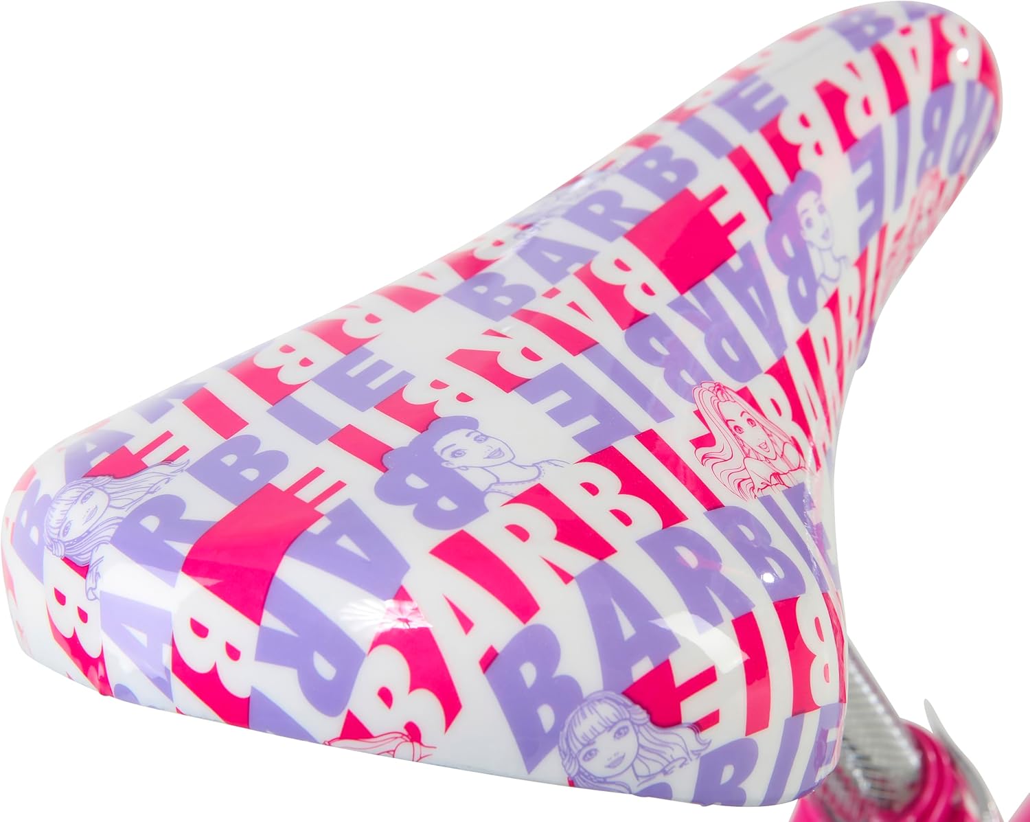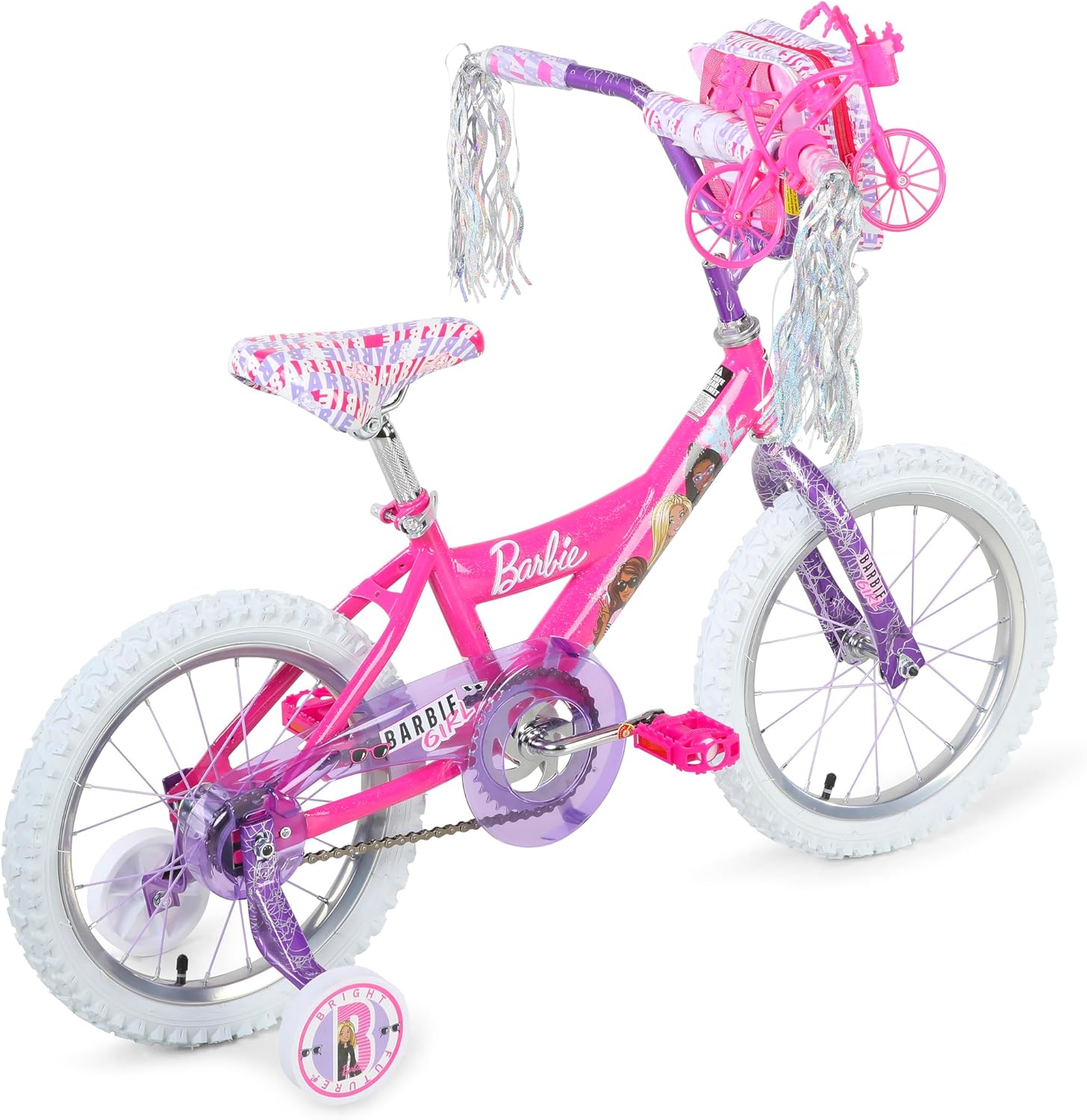 he Dynacraft Barbie 16-Inch BMX Bike features a vibrant pink and purple steel frame, coaster brakes, training wheels, a Barbie-themed saddle, streamer grips, a plastic chain guard, and steel rims with purple spokes, making it a fun and stylish ride for girls ages 5-7.