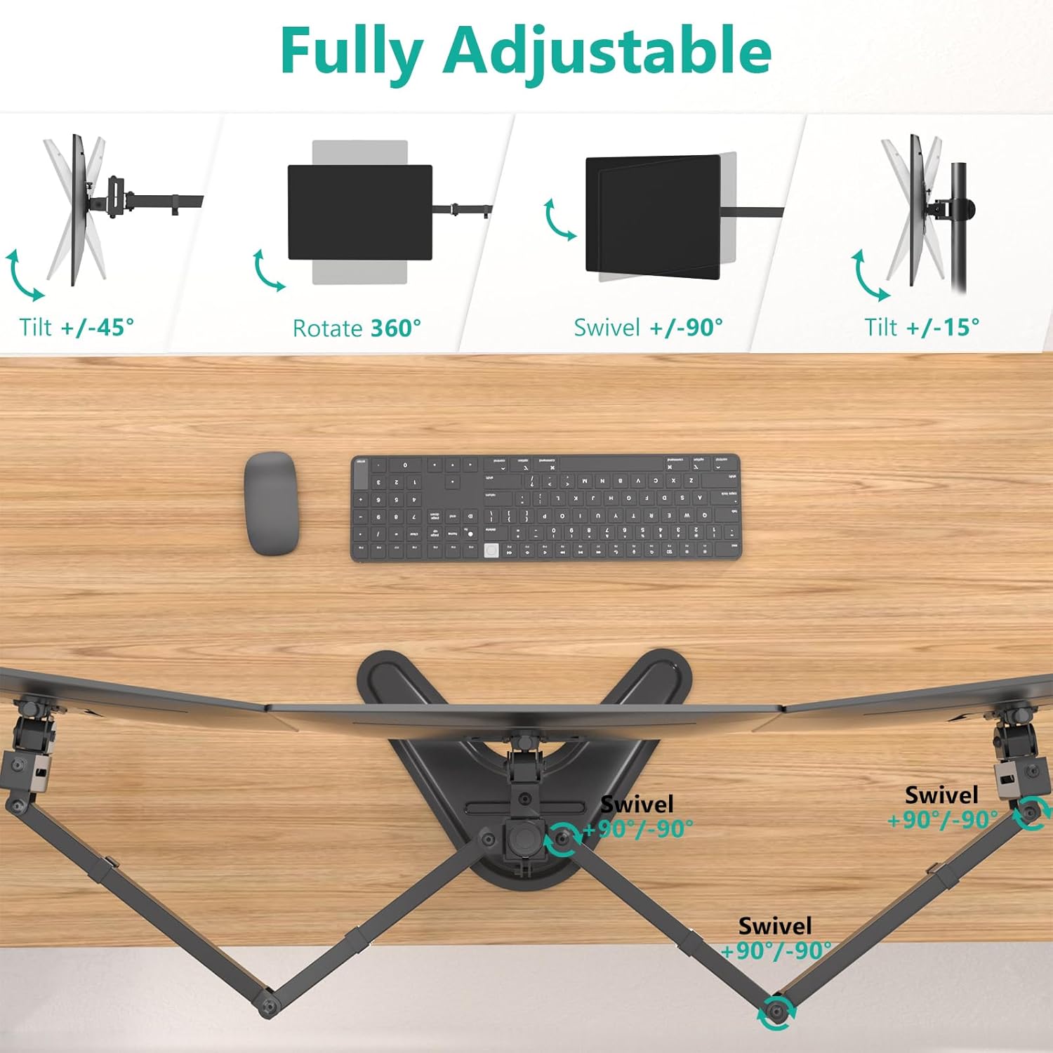 Fully Adjustable Mount Arms: The monitor arm can tilt +45°/-45°, swivel +90°/-90°, and rotate 360°, Max height is up to 15.7\', and max extension is up to 25.5\'. The triple monitor stand allow easy to adjust monitors swivel, tilt and rotate to find an optimal view angle and position for comfortable work.