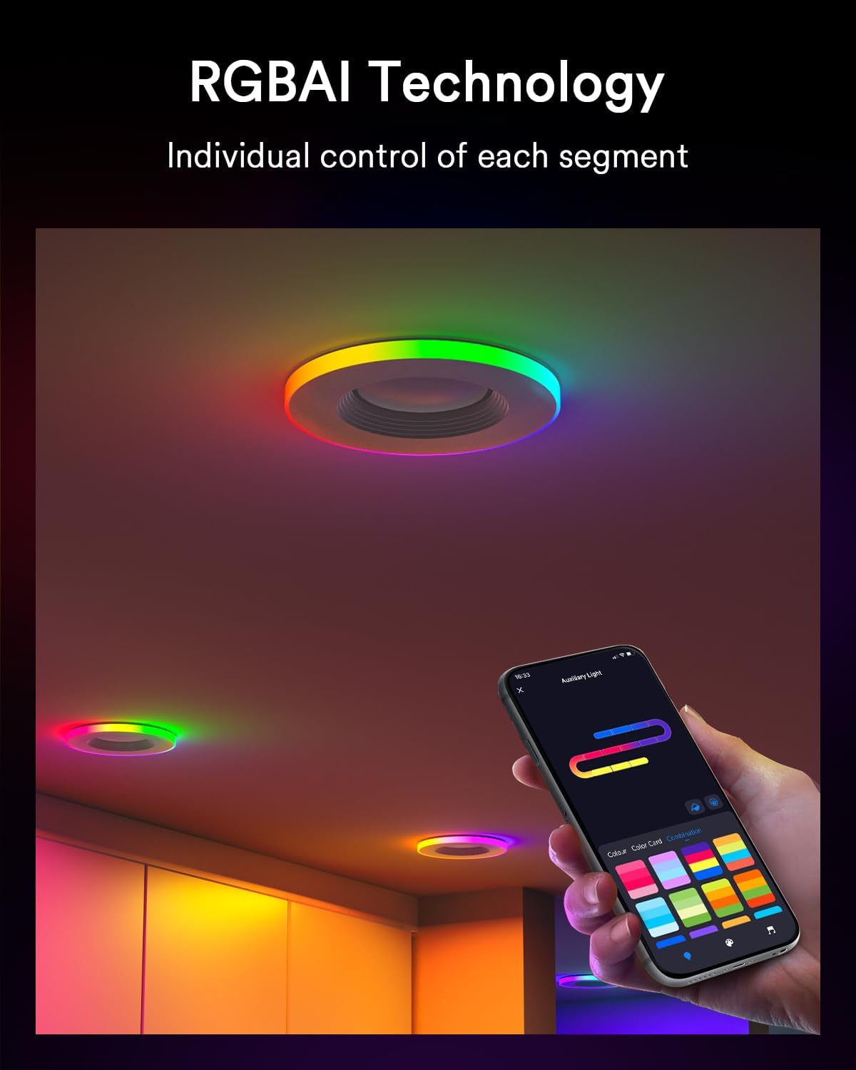 RGBAI for Auxiliary & CW+WW for Main: The maximum degree of customization to users that while programming RGB color changing from 16 million colors in the Aulixiary Light, the round Main Light is ONLY tunable 2700k-6500k warm white to cool white for reading or relaxing & 1-100% dimmable brightness. More combinations of lighting effects depend on your ideas
