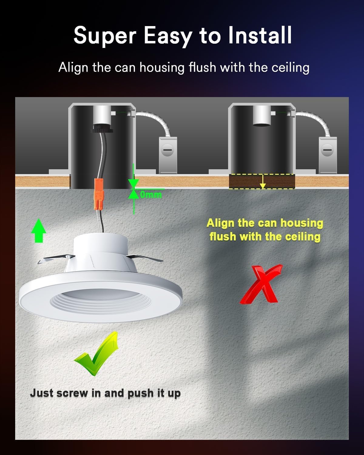 Easy Installation: Just Screw & Push upwards.Equipped new design triangle legs, the installation is like a breeze. Akin to screwing in a regular lightbulb. Push the housing clockwise to finish installation and turn the housing anticlockwise to removal. Besides, plastic body coverd can lights enhancing 50% wi-fi signal stable. Noted, Align the can housing flush with the ceiling. Do not add extra trim for can, Please remove them and finish the easy mounted