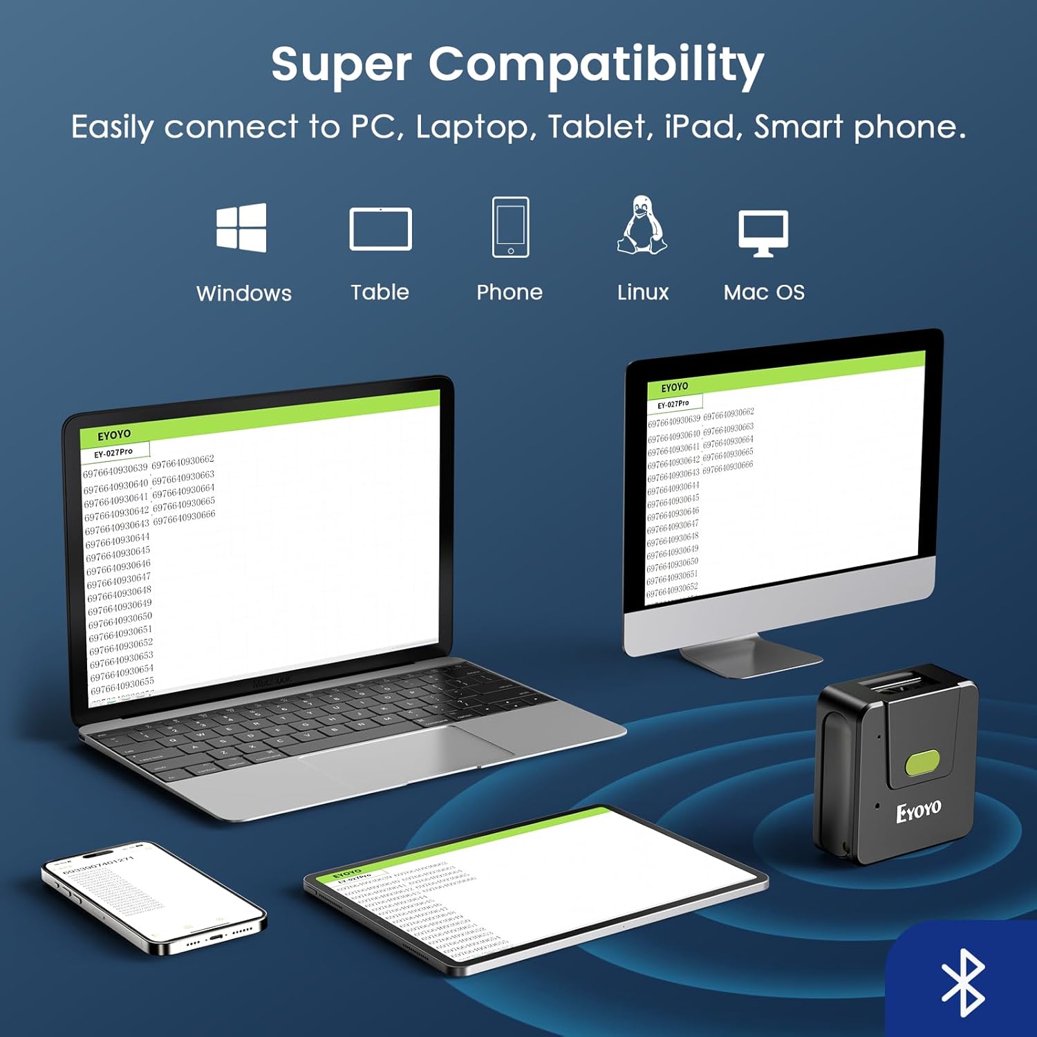 Bluetooth & USB Connection, Cordless & Corded Freely Convert: While working in a walk-around or flow line, stay within the range of Bluetooth support and choose the Bluetooth pairing mode that can be moved at any time. Meanwhile, if you don`t have a Bluetooth-enabled device or work in a seated shift, you can connect the barcode scanner to your computer via USB cable. In a word, the Eyoyo wireless scanner supports connecting with your laptop, MAC, iPhone, Android, and tablet