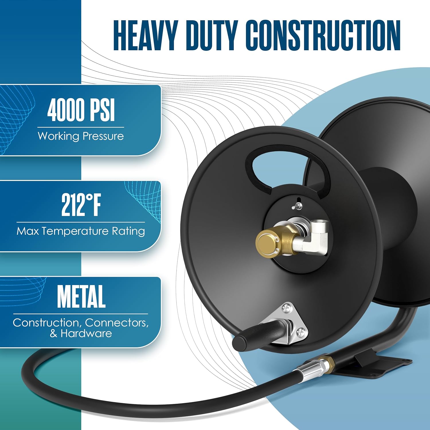 HEAVY DUTY CONSTRUCTION - Built for demanding tasks, this high pressure hose reel features a heavy-duty iron construction with a durable black powder-coated finish for corrosion resistance. It’s rated for temperatures up to 212°F and supports a working pressure of up to 4000 PSI, allowing it to handle high-pressure cleaning jobs. This design ensures long-lasting performance in both commercial and residential settings.
