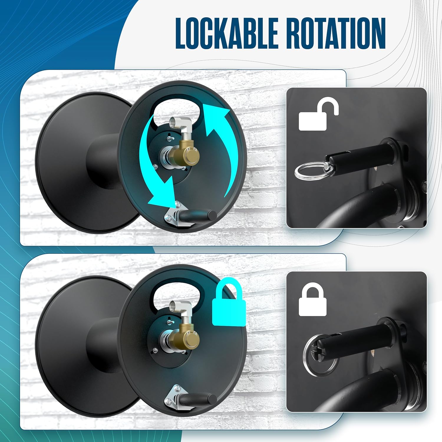 LOCKABLE ROTATION - The pressure washing hose reel features a lockable rotation mechanism that keeps the hose securely in place during use or transport. This added control prevents unwanted unwinding and makes operation more secure and safe, whether mounted on a wall or in a vehicle.