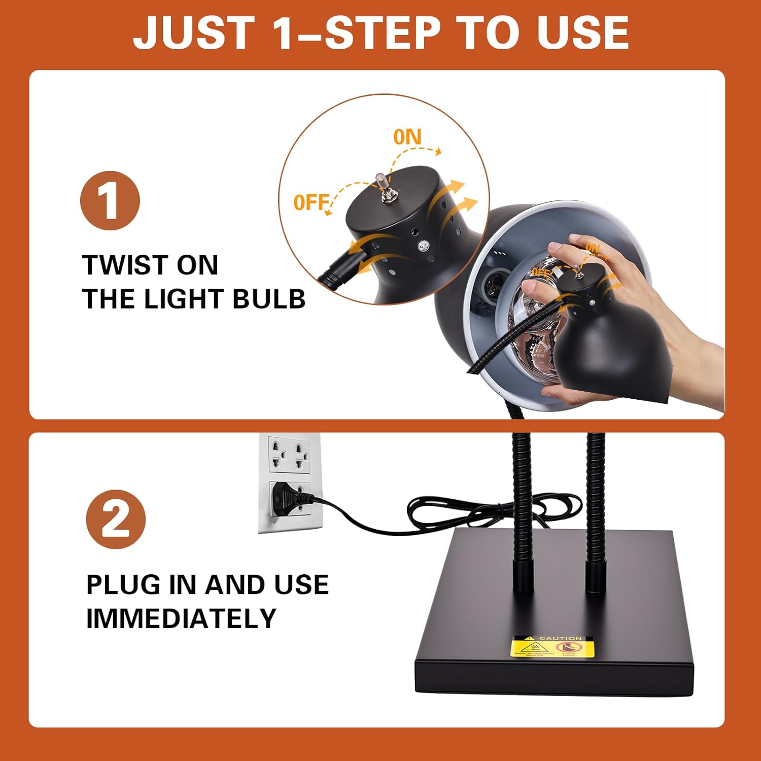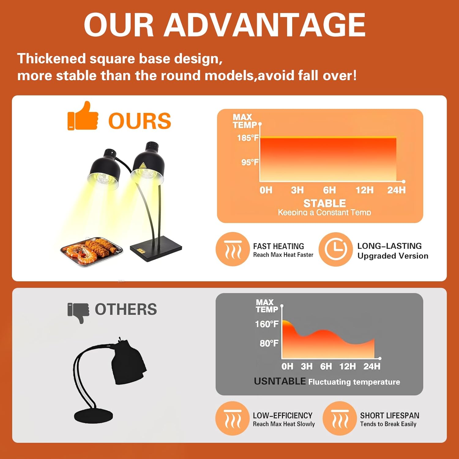 Thicked Square Base: We`ve redesigned the base weight of our food heat lamp for enhanced stability. The new, weighted square base is far more stable than common round bases. This design effectively prevents the lamp from tilting or toppling over, even in busy environments. Size is about 11.7 x 7.8 inch. PLEASE CHECK YOUR SPACE SIZE BEFORE PURCHASE! Whether it`s placed on a crowded buffet table or a bustling restaurant counter, you can trust that our heat lamp will stay firmly in place, providing reliable service.