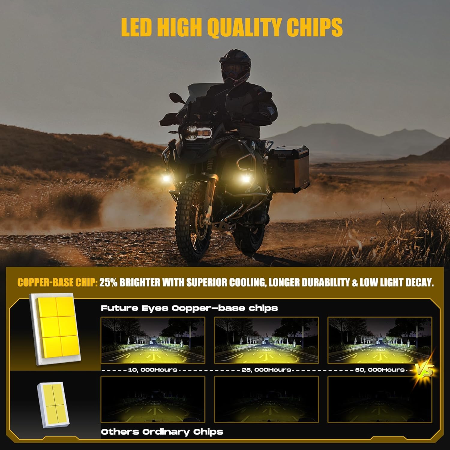 Superior Heat Dissipation and Waterproof Performance: Built with high-quality LED chips (copper-core) and a durable aluminum housing, these LED fog lights for motorcycles ensure efficient heat dissipation, preventing overheating and extending product life. With an IP67 waterproof and dustproof rating, these off-road lights maintain stable performance in rain, snow, or dusty terrain, making them an excellent choice for dirtbike headlights and outdoor motorbike adventures.