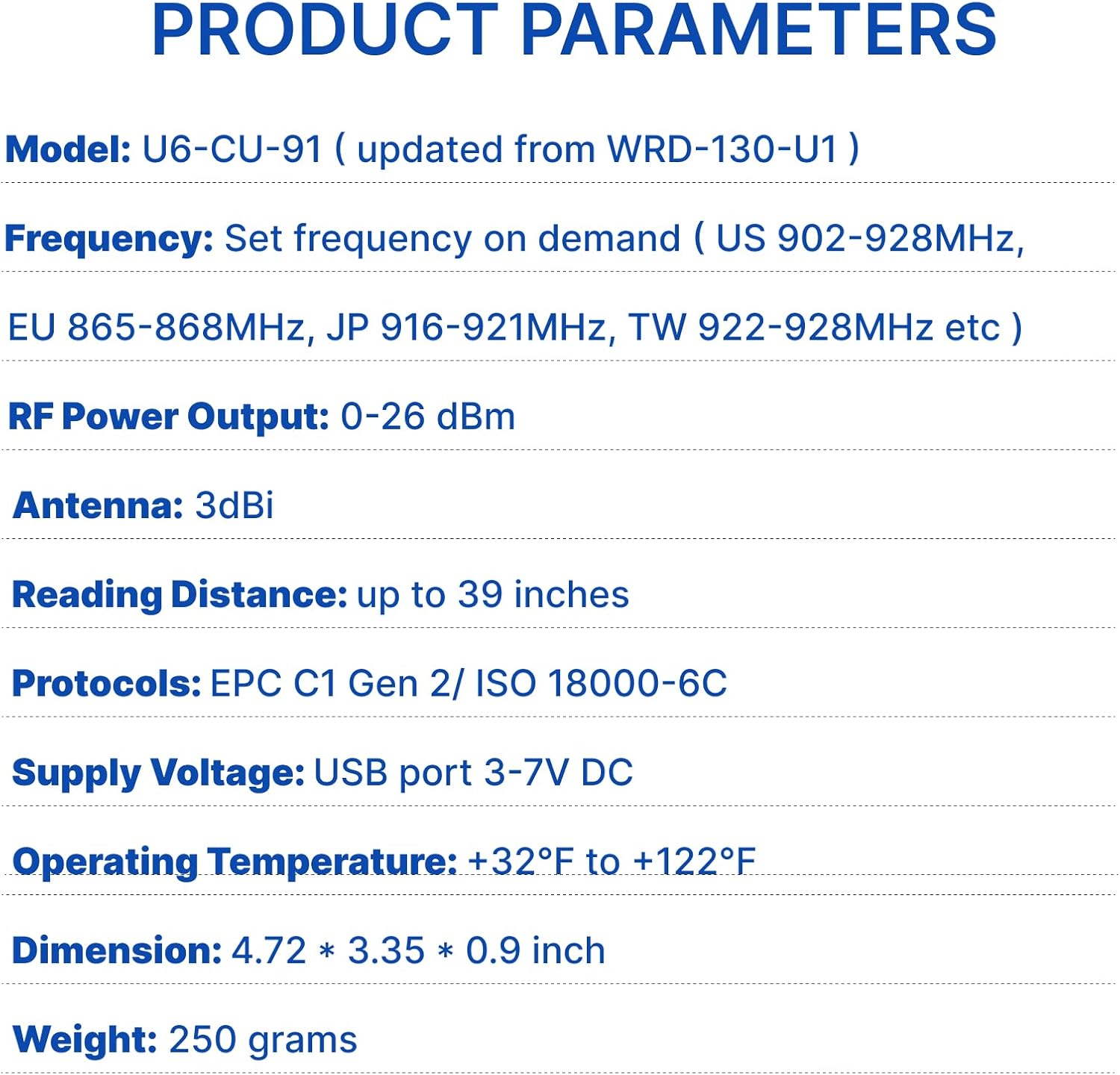 Reading Distance: The reading range is up to 39 inches (depending on the antenna and field strength)