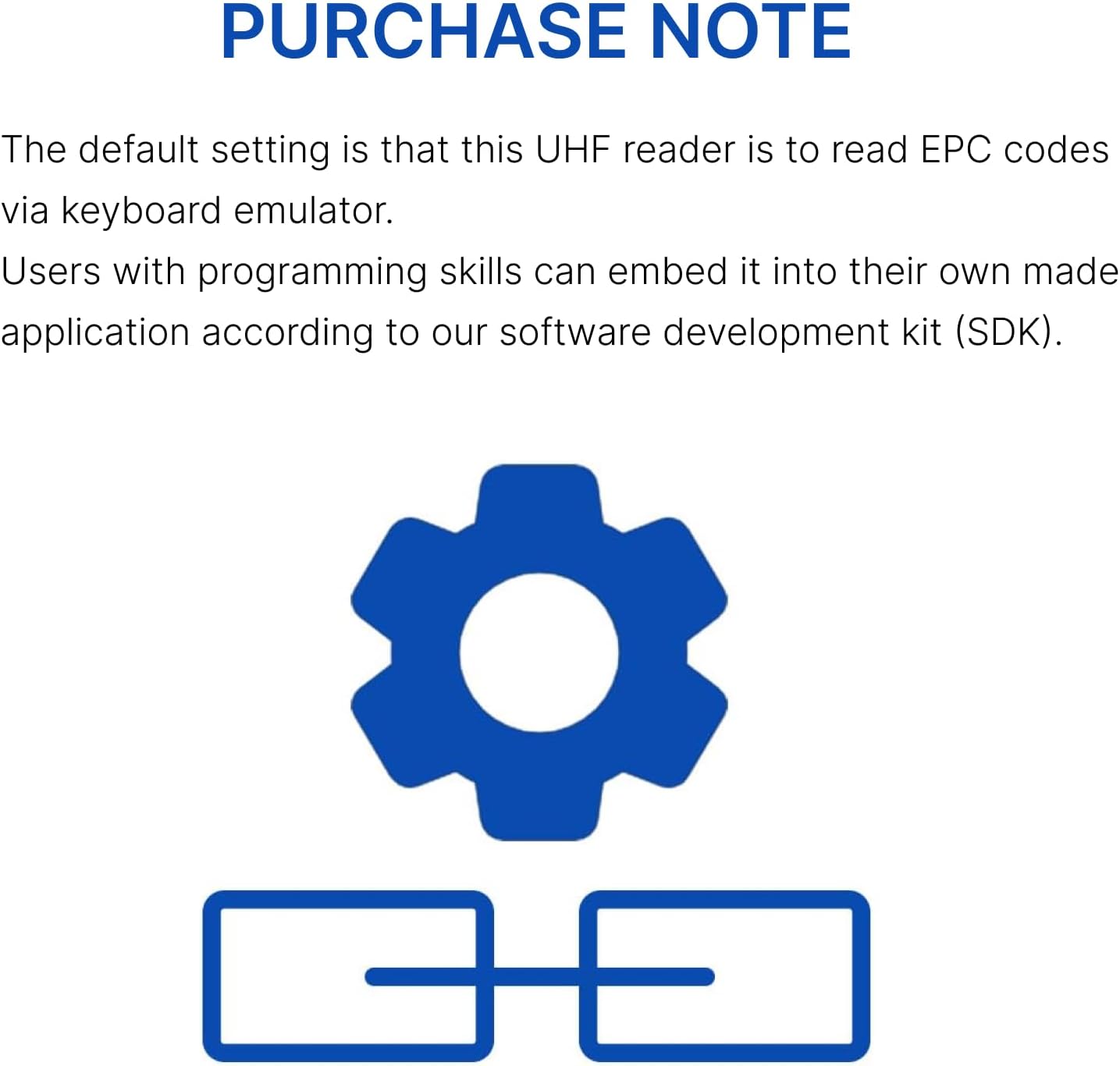 How to Use: The uhf reader is able to read UHF tags via keyboard emulation output. With the config tool, users can easily set up the frequency range, data output format and even write the tags. And the DLL files and programing examples in the SDK allow the users to develop their own software applications