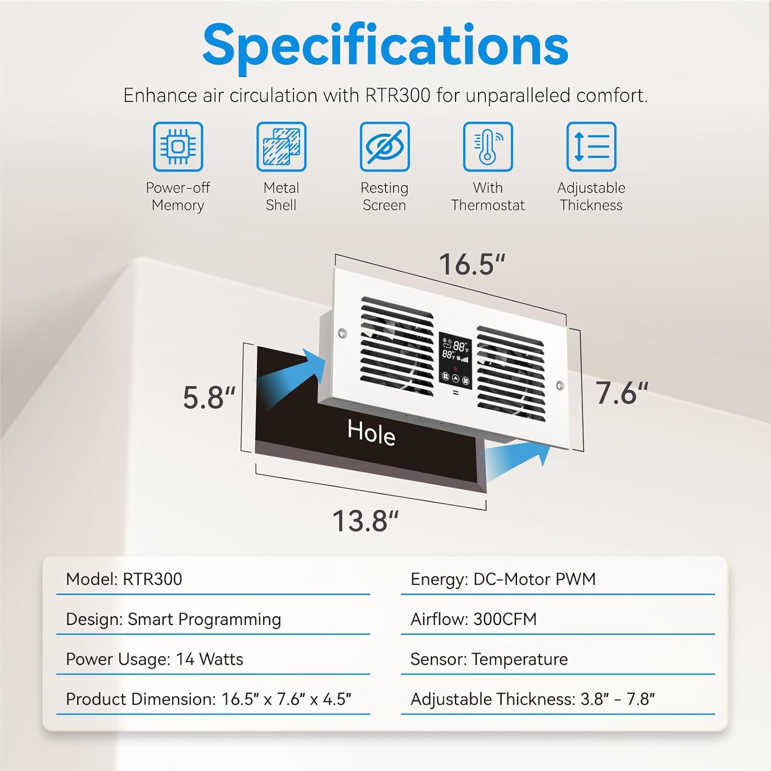 Comfort setting: The RTR320-CV ventilation fan is equipped with a temperature sensor that allows you to select a temperature range of 35°F to 99°F, ensuring customized airflow for year-round comfort. In addition, with five air speed settings, you can fine-tune the strength of the airflow to your liking, striking the optimal balance between comfort and efficiency.
