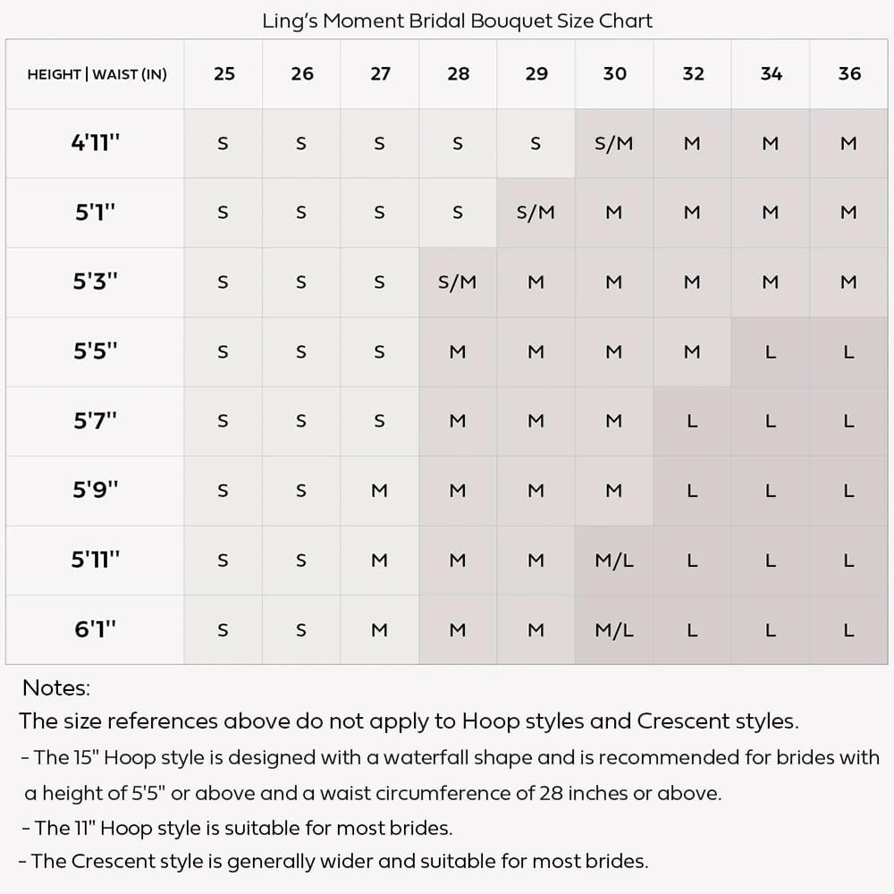 Size: This Wedding Bouquets for Bride is approx. [15 inches W x 11 inches H]. Handle length 4.3inch. With ribbons card. This size is typically suitable for most brides to carry, this one is recommend for 5`3\'-6`1\'height and 28\' waist, 5`1\'-6`1\'height and 29\' waist, 4`11\'-6`1\'height and 30\' waist, 4`11\'-5`5\'height and 32\' waist, 4`11\'-5`3\'height and 34\' waist, 4`11\'-5`3\'height and 36\' waist.