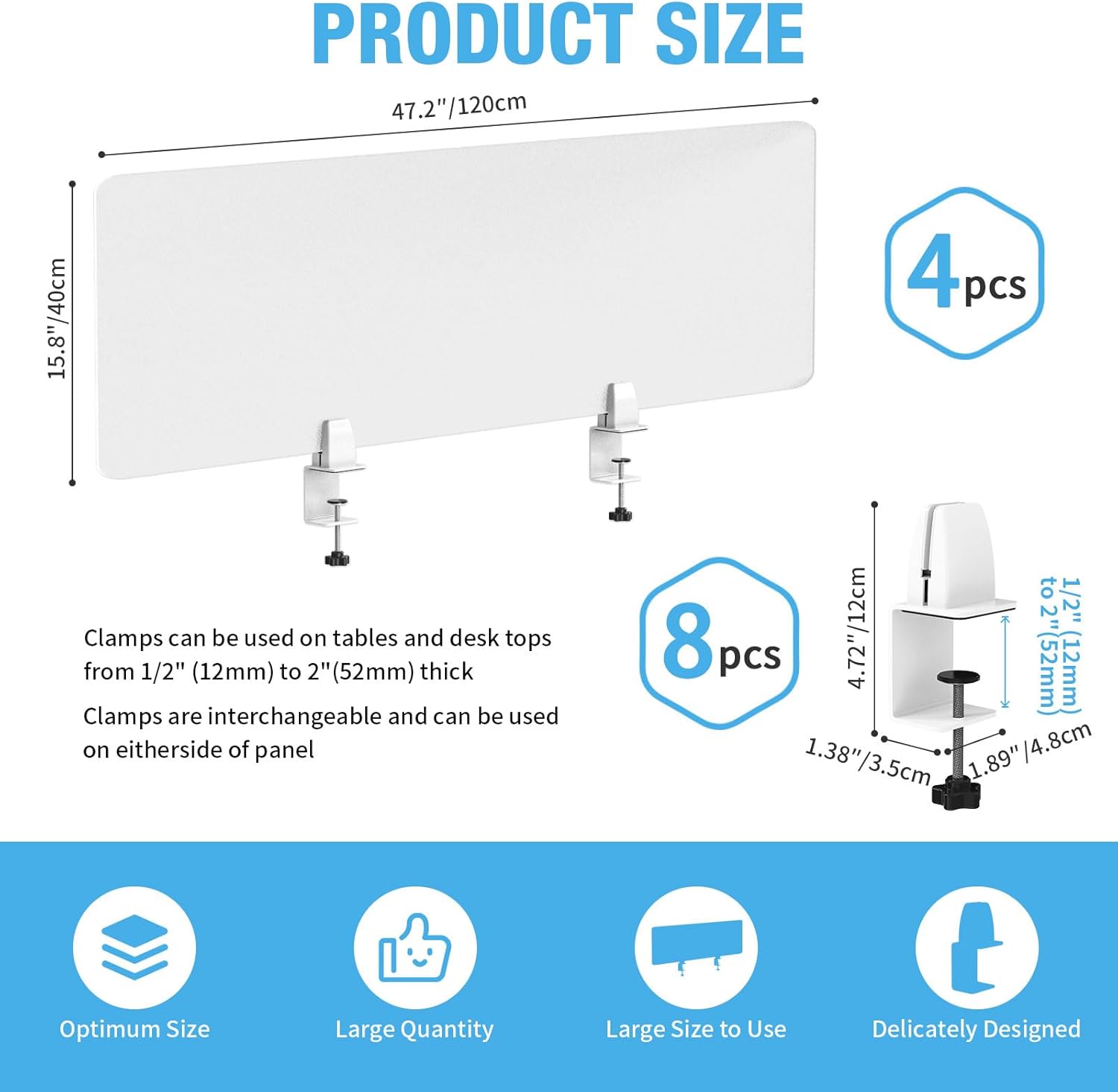 Desk Divider Set-Product Size: 47.2``L x 15.8``W;Amount: Pack of 4 Pcs;Quantity of Universal Clamps: 8;Material: Acrylic ;Colorl: Frosted;Our 4 sets of desk divider privacy panels can easily separate open work or study areas, allowing you to enjoy private space and prevent interference while also being with colleagues and classmates.