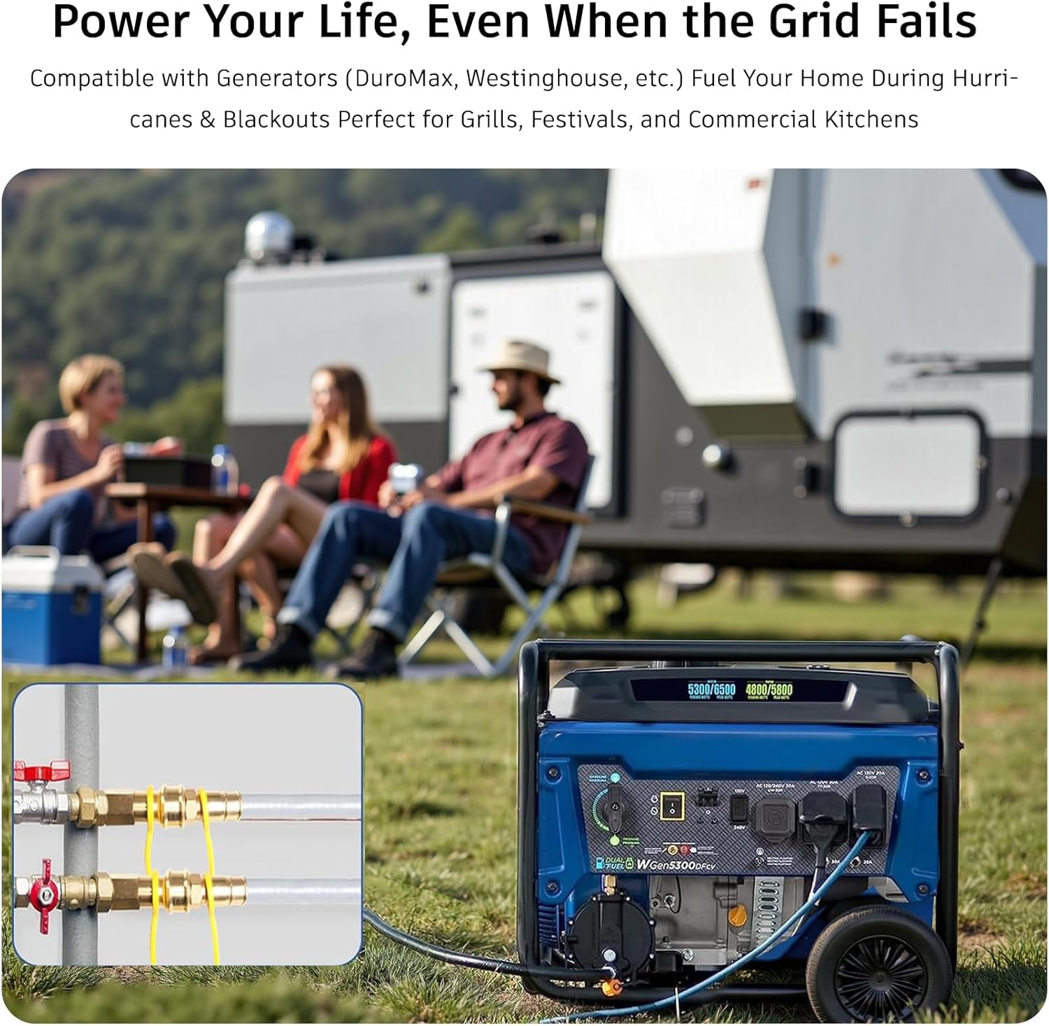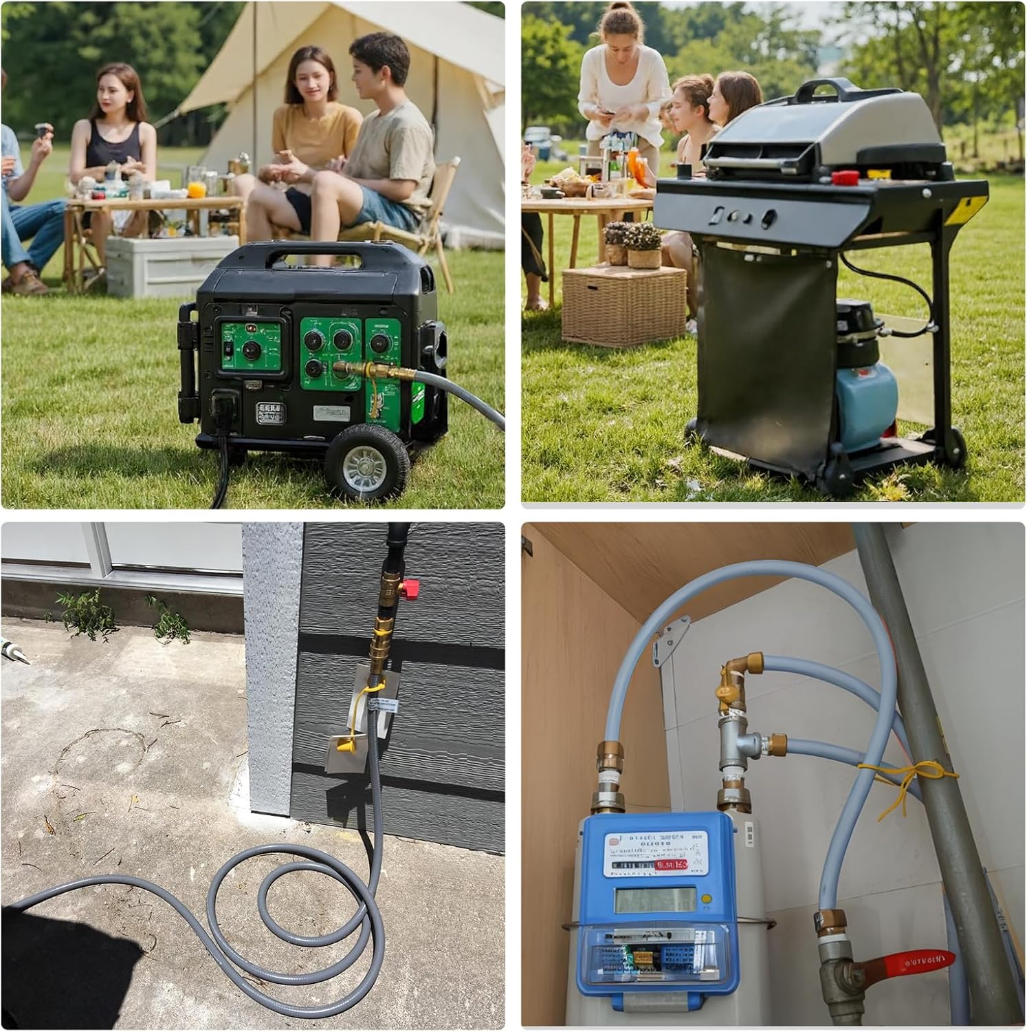 Universal Compatibility&High BTU Support: Our 11FT3/4\' ID Natural Gas Hose is Designedfor generators(12,000-15,000W),Weber grillspizza ovens,and propane/NG devices.Our 50FT3/4”ID natural gas hose includes 3/4 maleswivel,quick commect adapter,and ballvalve-ideal for hurricane season outages oroutdoor cooking with high BTu demands.