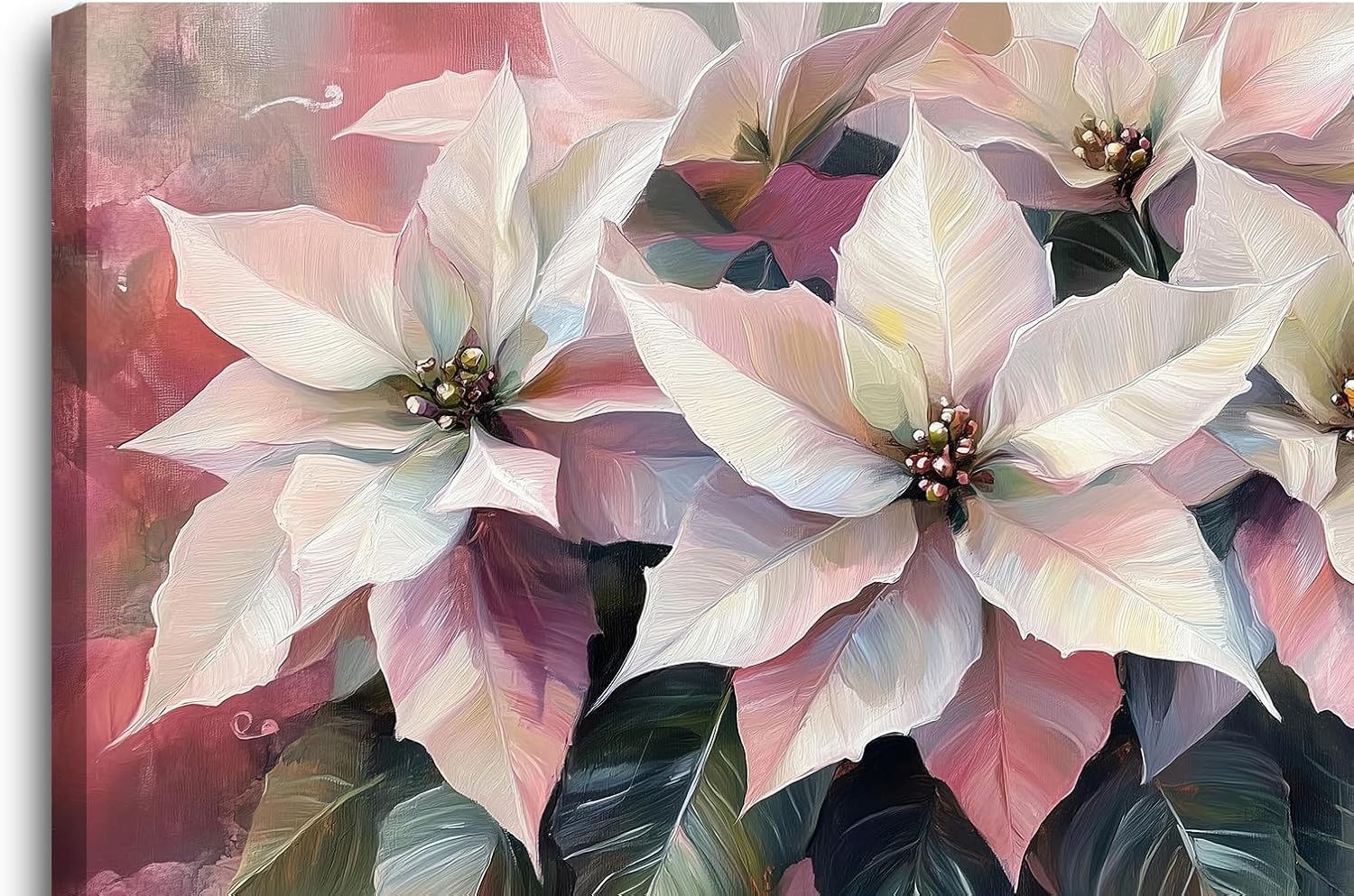 Vintage Framed Wall Art 60x30 Inch - White Poinsettia, Holiday Floral Decor