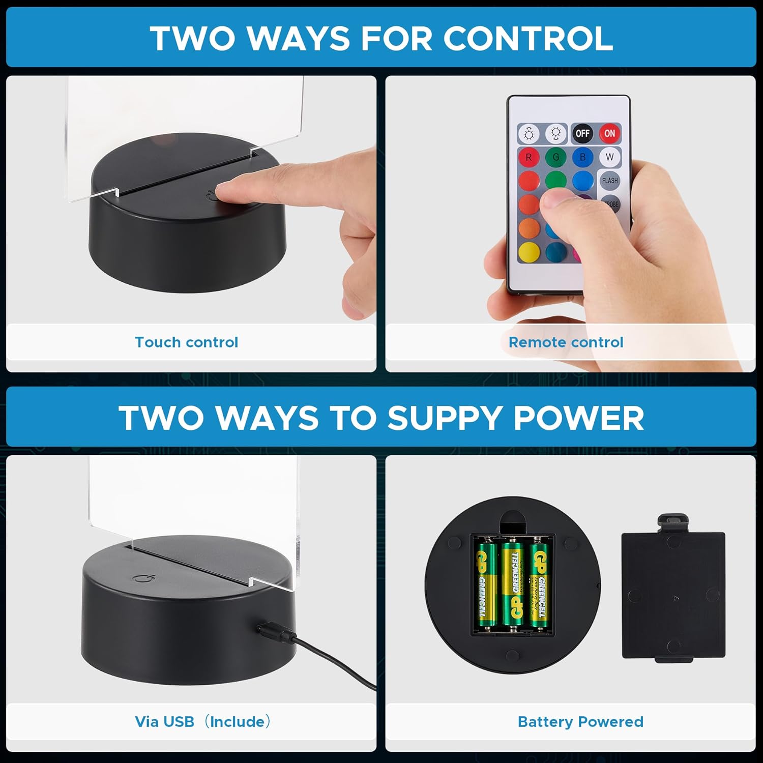 Convenient Controls: Easily control these LED lamps with the adjust colors, modes, and power, or use the touch buttons on the LED light bases. Power them via USB for everyday convenience or with batteries (not incl.) for flexible placement