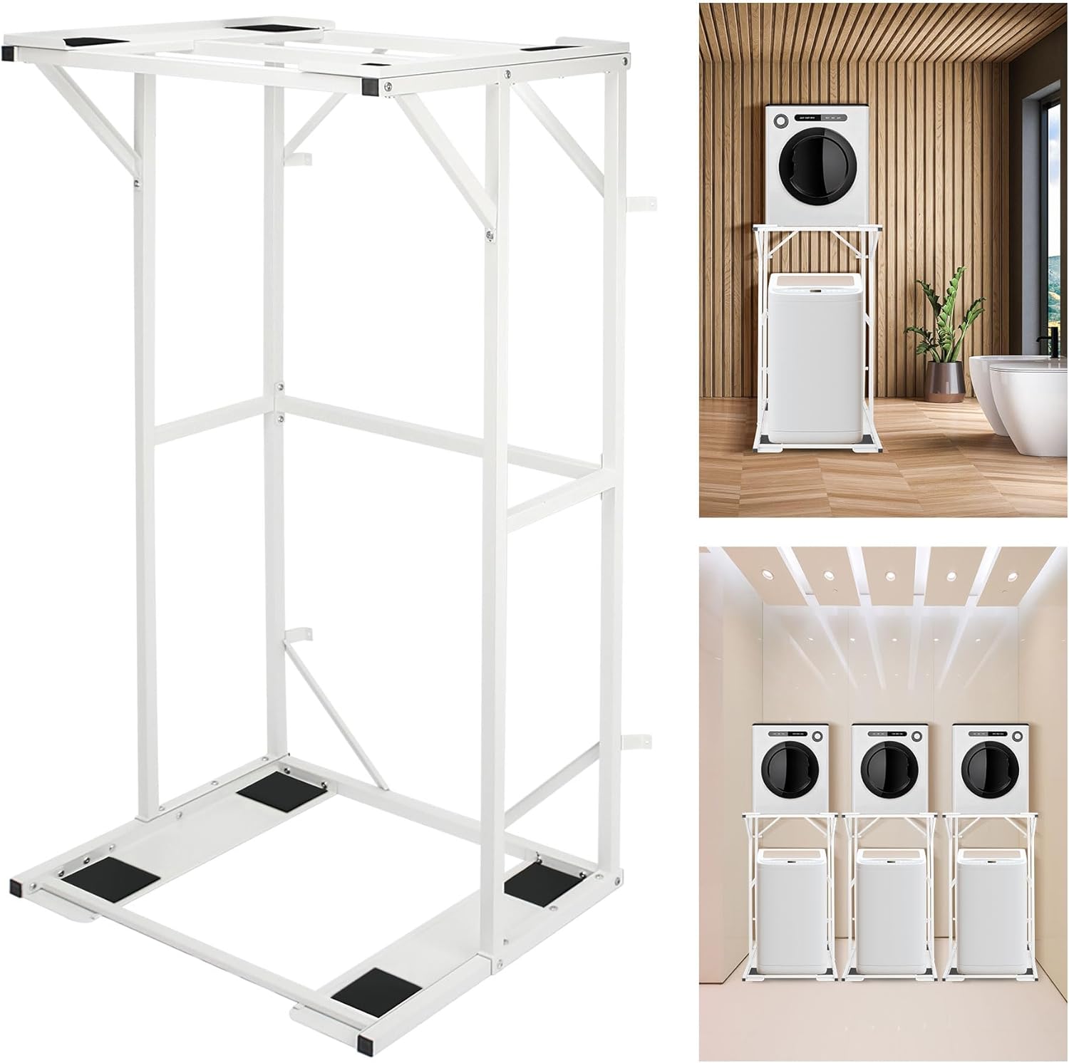 Safe and Stable Design:The bottom of our portable washer and dryer stand adopts non-slip mat design to prevent the shelf from sliding,so that the shelf is more firmly placed on the ground,in addition,the design of triangular support frame between the base and the cross bar provides more stability for our shelf,you can safely rest assured that your equipment is placed on it