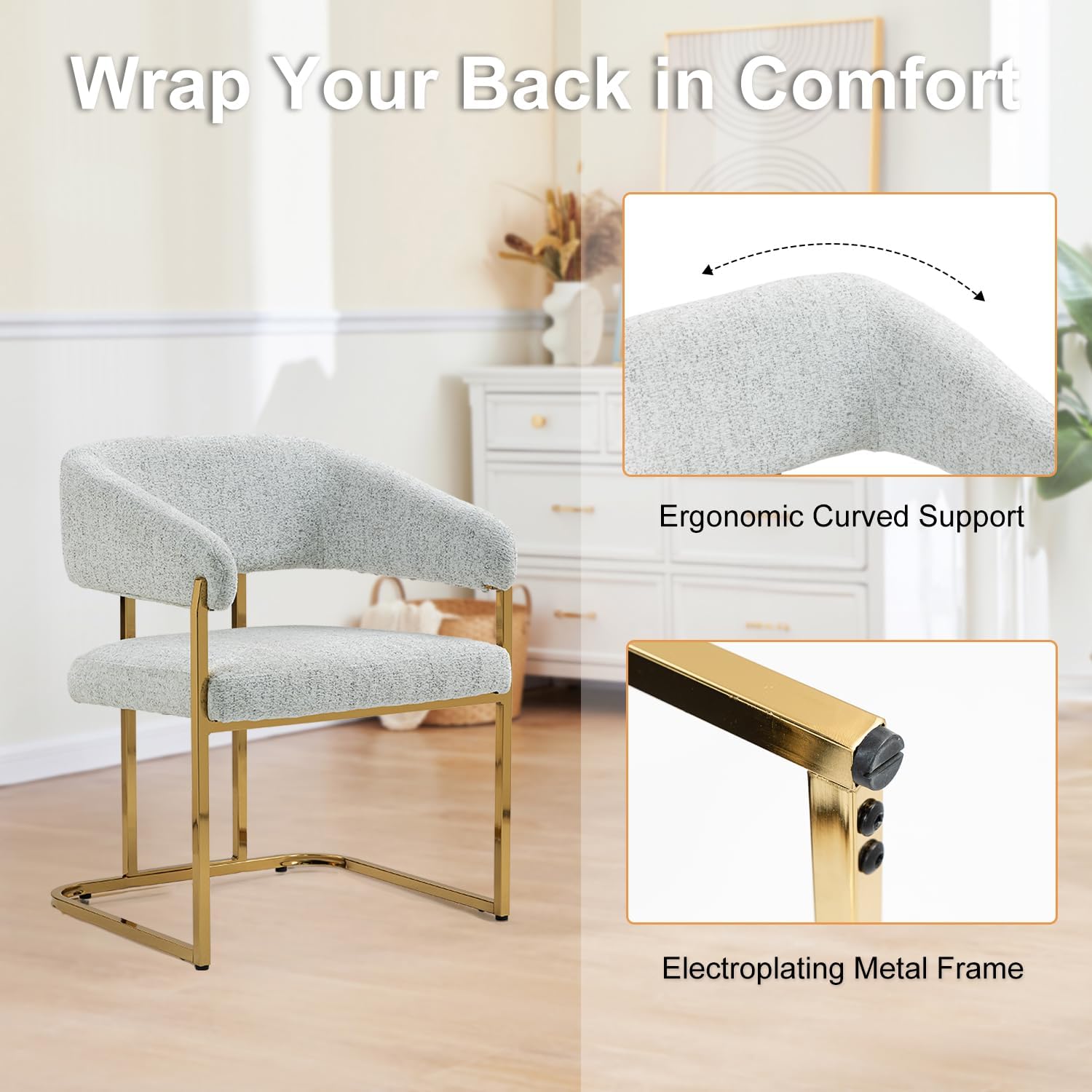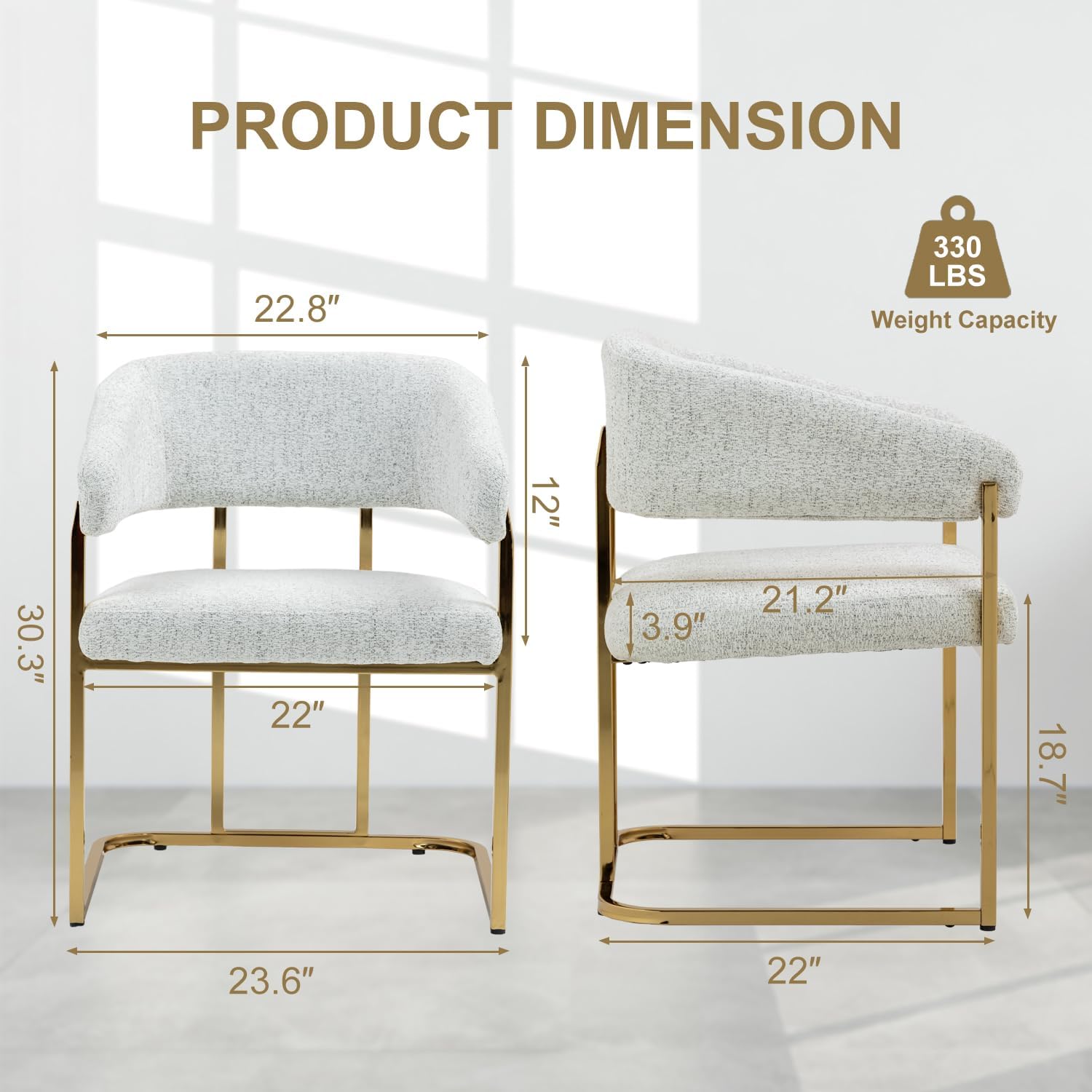 Sturdy StructureThe dining room chair has a sturdy and stylish gilt metal frame for added security, we added two additional metal supports to make the chair more robust, with a maximum weight capacity of 330 lbs, ensuring years of use. And the non-slip foot pads of the chair can protect the floor from scratches and minimize noise.