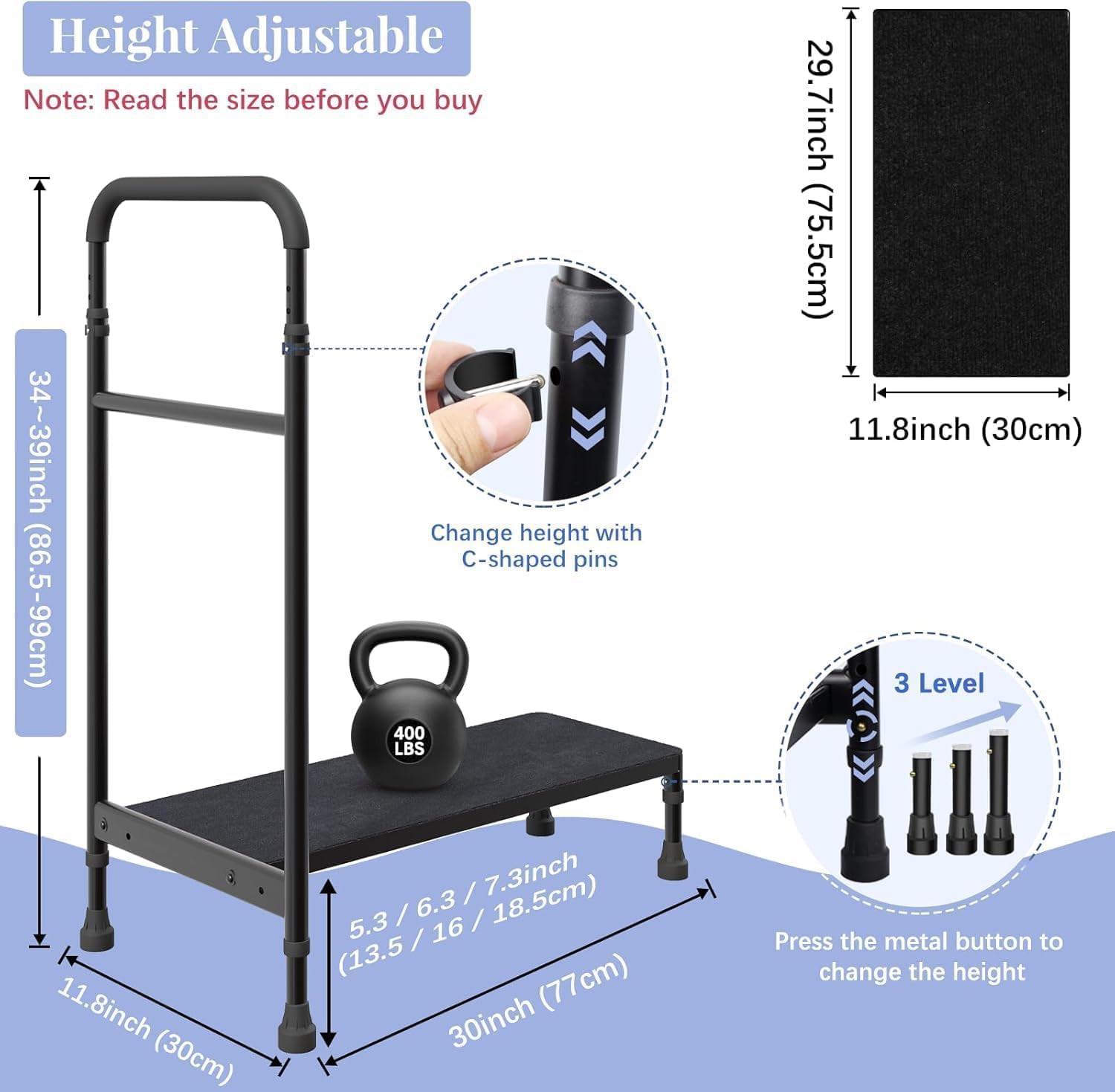Height Adjustable: Featuring adjustable height handrails, you can customize the step stool with handrail to your preferred height, ranging from 34\' to 39\'—and set the step height to 5.3\'/6.3\'/7.3\'. The adjustable handles allow for a personalized fit, providing extra support and reducing fall risk. Find your safest, most comfortable position for independent living and effortless mobility (As shown in image 2, to adjust the height)