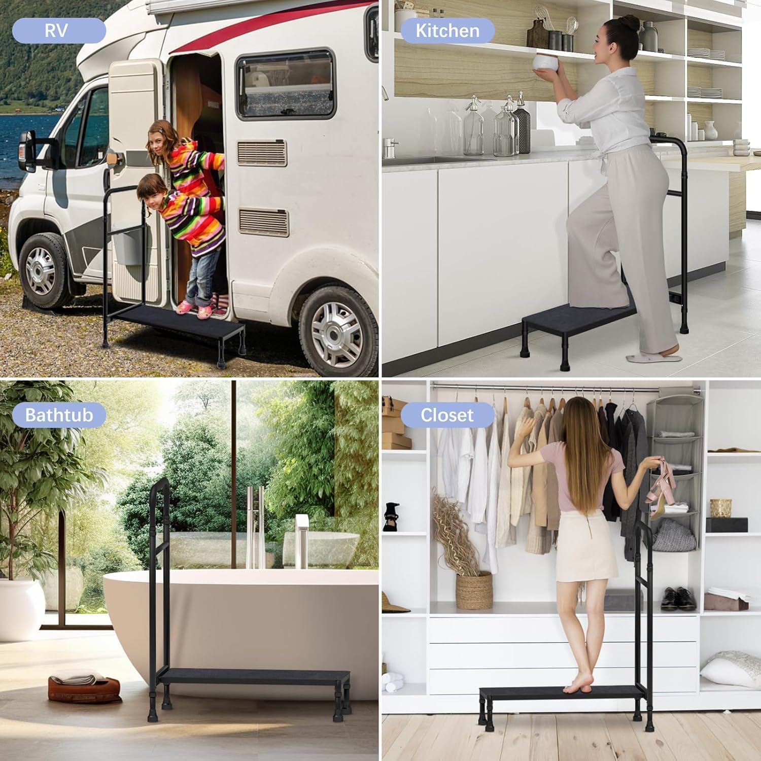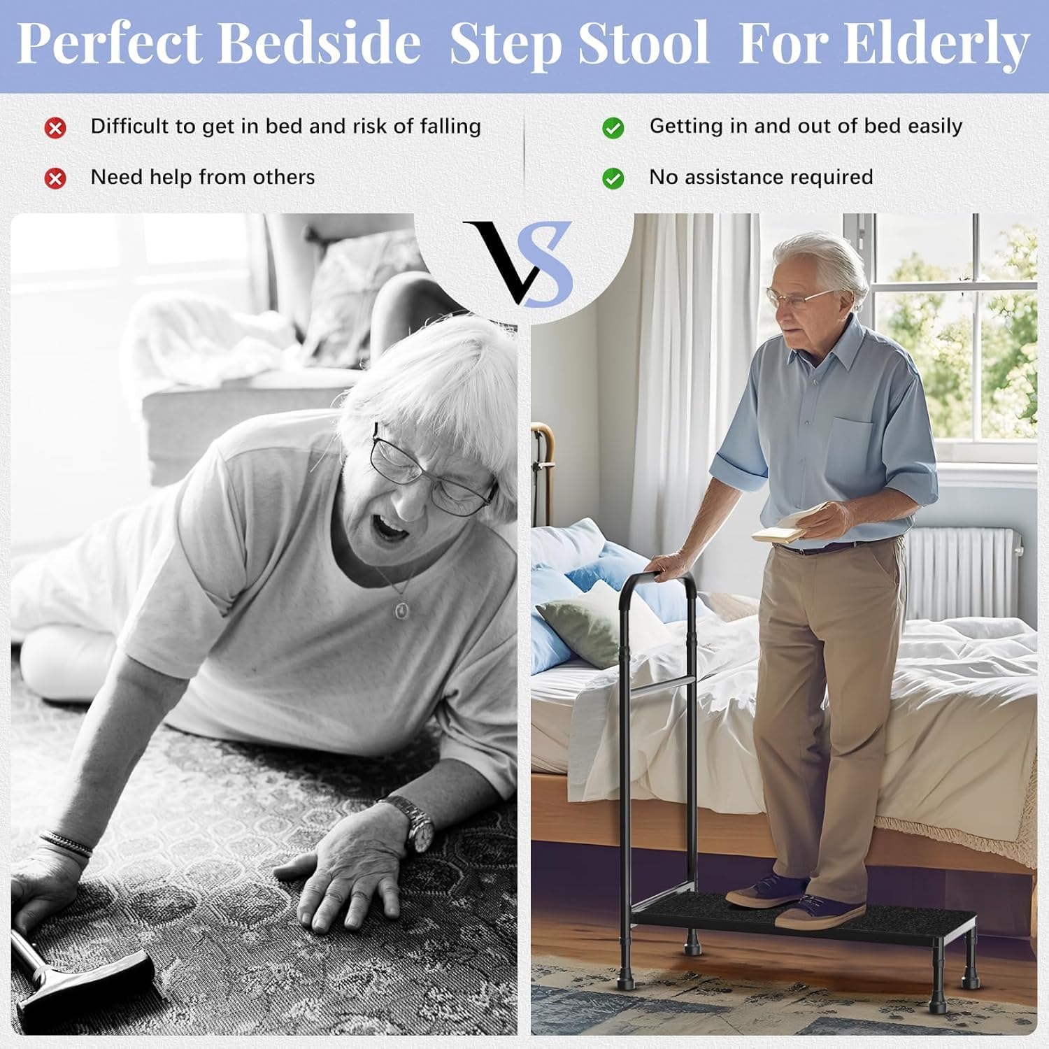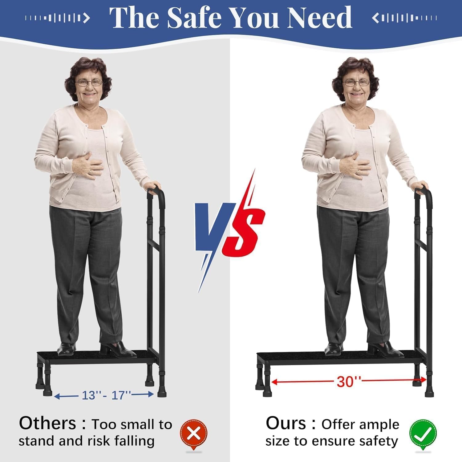 Extra-Long Platform Design: Specifically designed for the elderly and high-bed users, our step stool with handle for elderly features an extended 30.5\' platform, significantly larger than regular step stools (13\'-17\'). This generous length provides a broad surface for turning around and stepping on and off, reducing the risk of falls and offering a more stable and secure footing. Perfect for high beds, tubs, or SUVs, it ensures users can comfortably and confidently get in and out of elevated surfaces