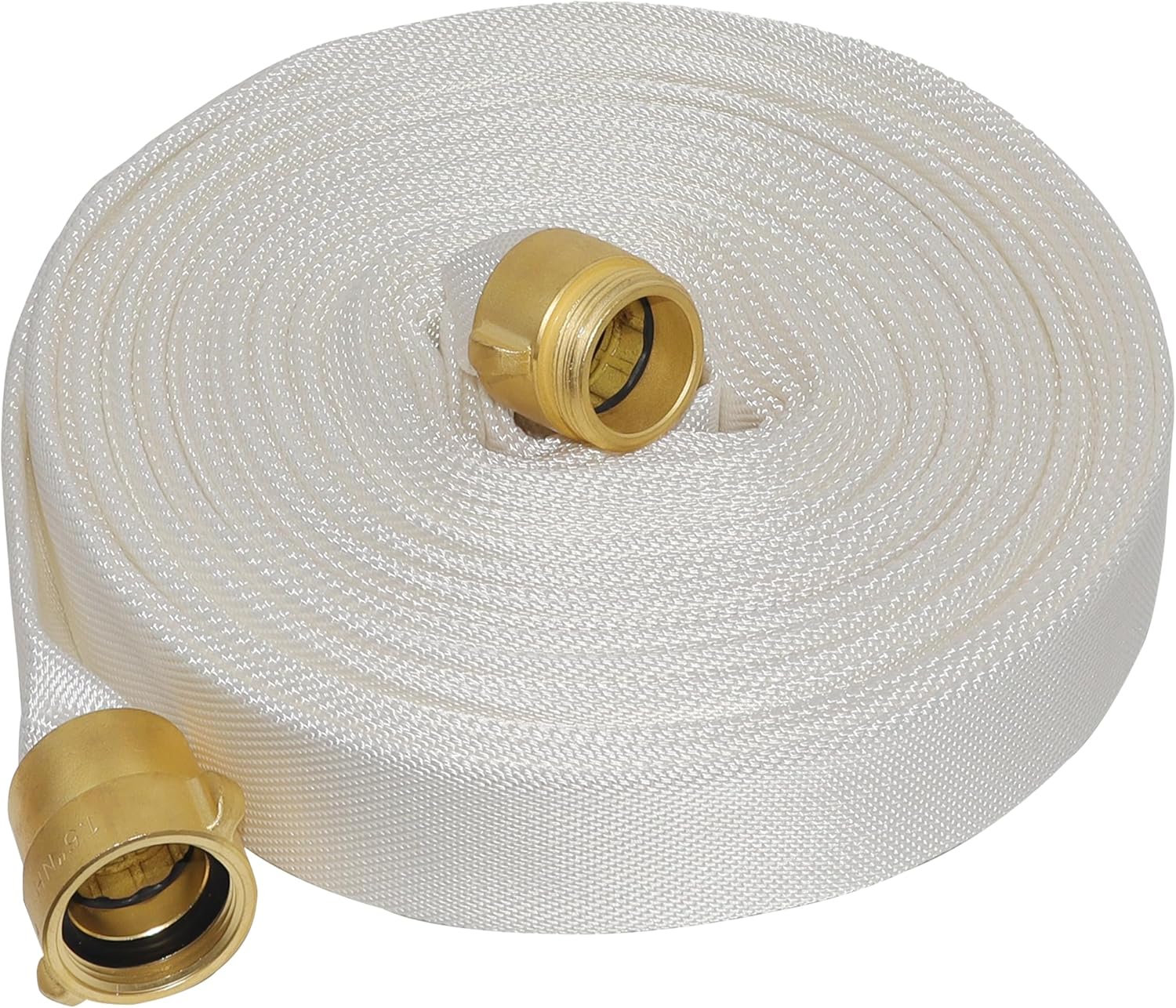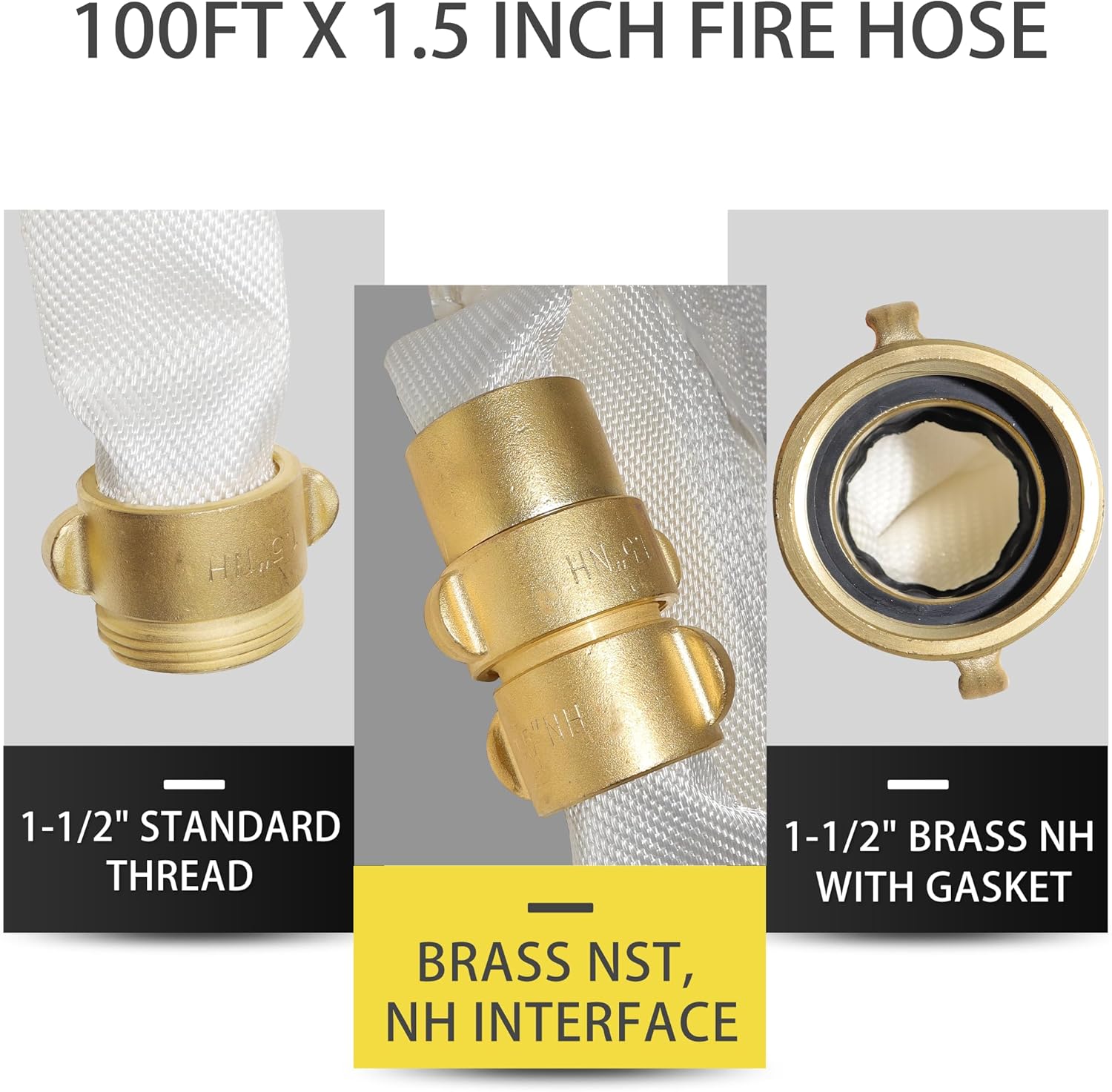 Fire Hose 100 FT x 1-1/2" ID, Brass NST, NH Interface, TPU, Polyester, Working Pressure 250 PSI, Burst Pressure 500 PSI, Ind
