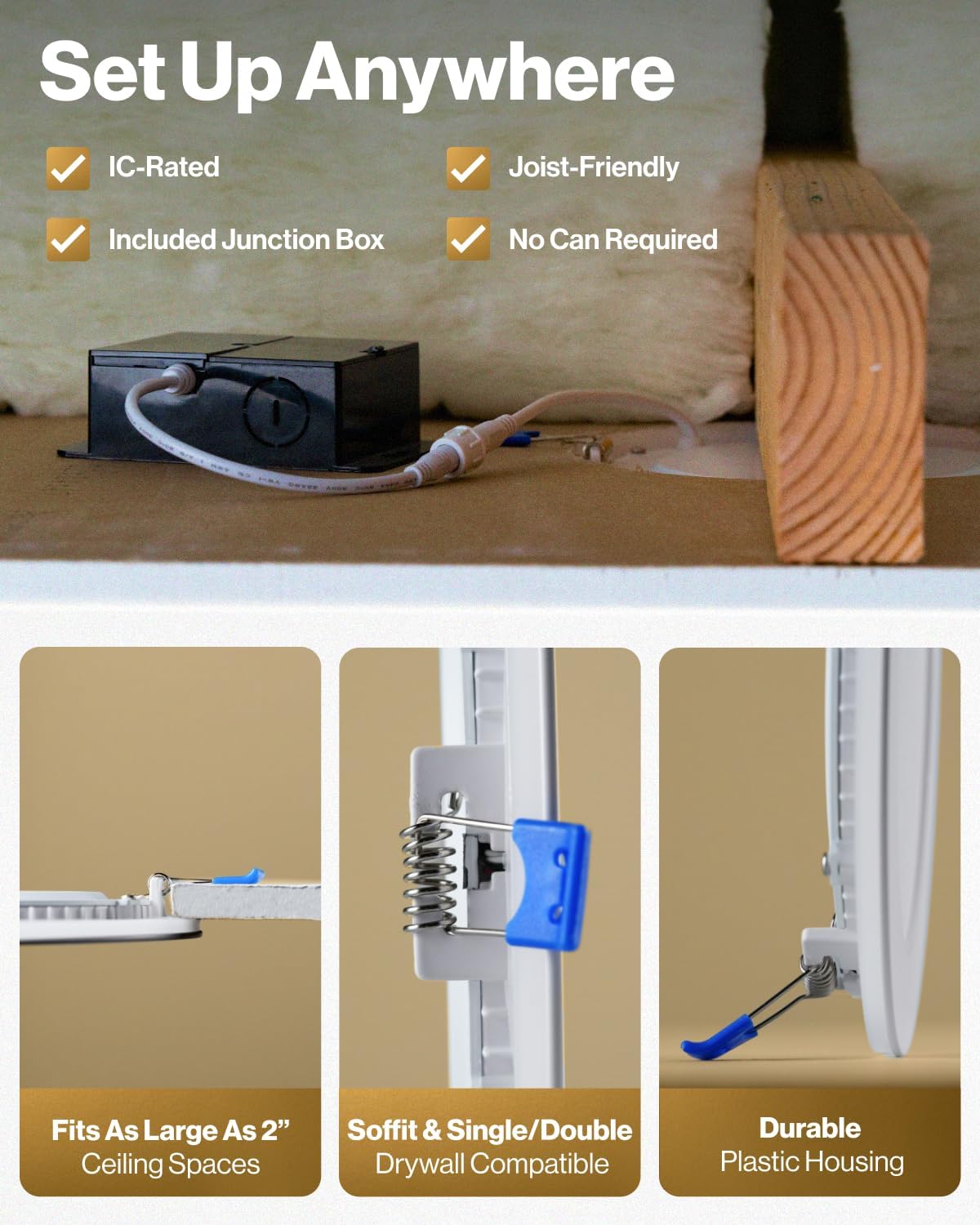 EASY TO INSTALL - Whether you`re installing into a single drywall, double drywall, or soffit, you can speed up the process thanks to our spring-loaded brackets! There`s also no need for a can since our LED downlights come with a junction box!