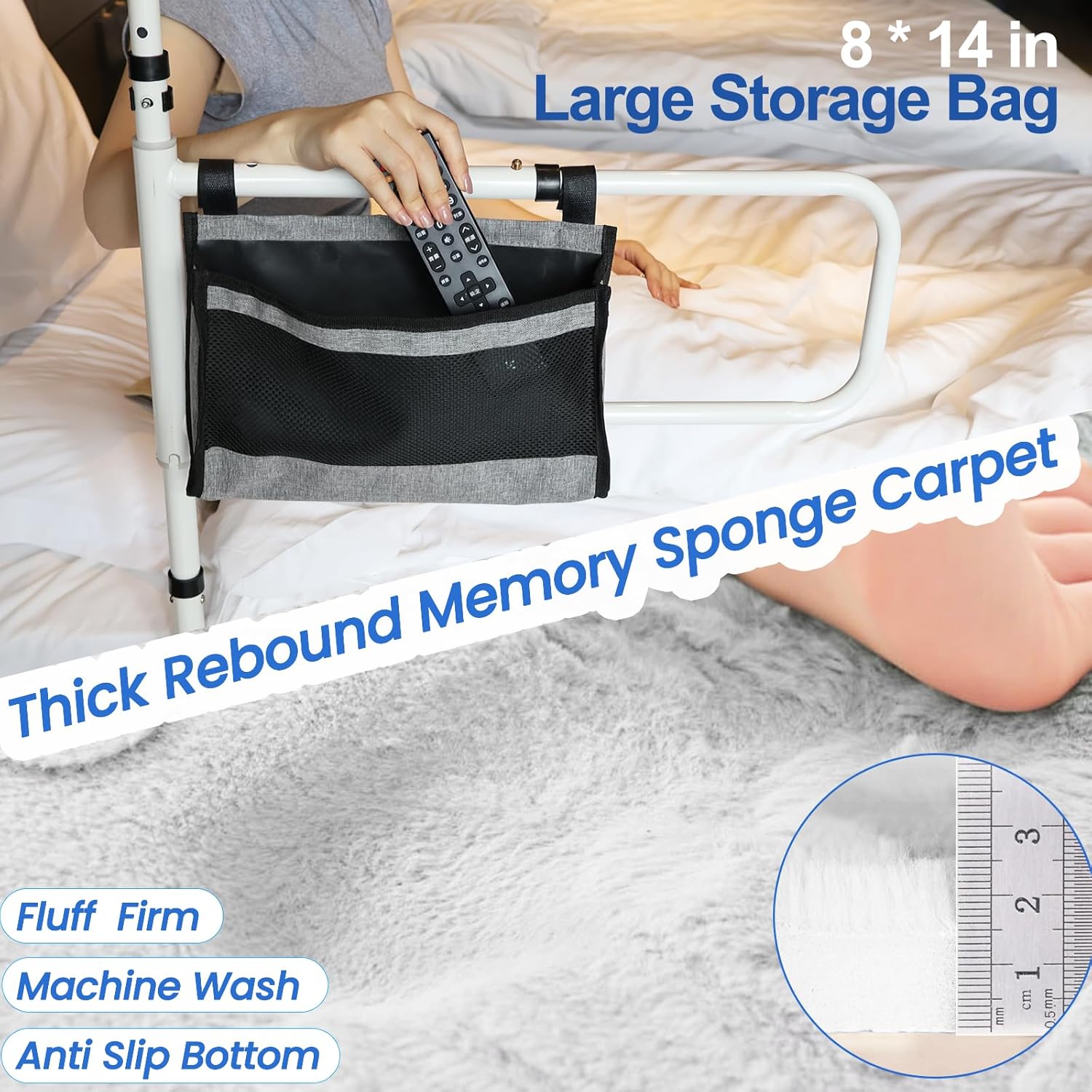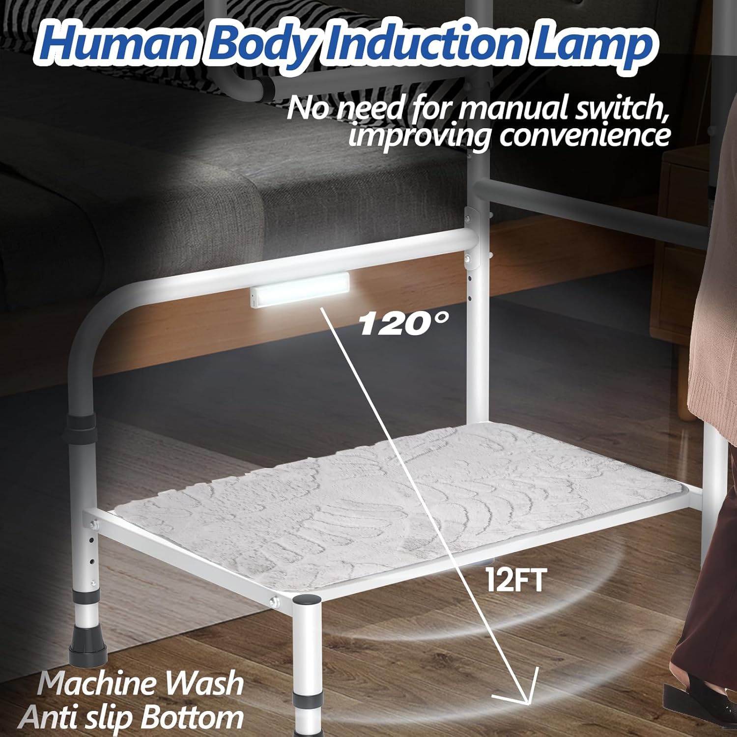 Thoughtful designStep stool for bedside for adultsis equipped with sponge pad armrests, which are comfortable, non slip, and not icy to the touch. A rechargeable light with manual adjustment and induction dual mode to avoid night time interference caused by induction lighting. Thick memory sponge rebound anti slip pad, soft and comfortable to step on. 8 * 14 inch large storage bag for easy placement of items