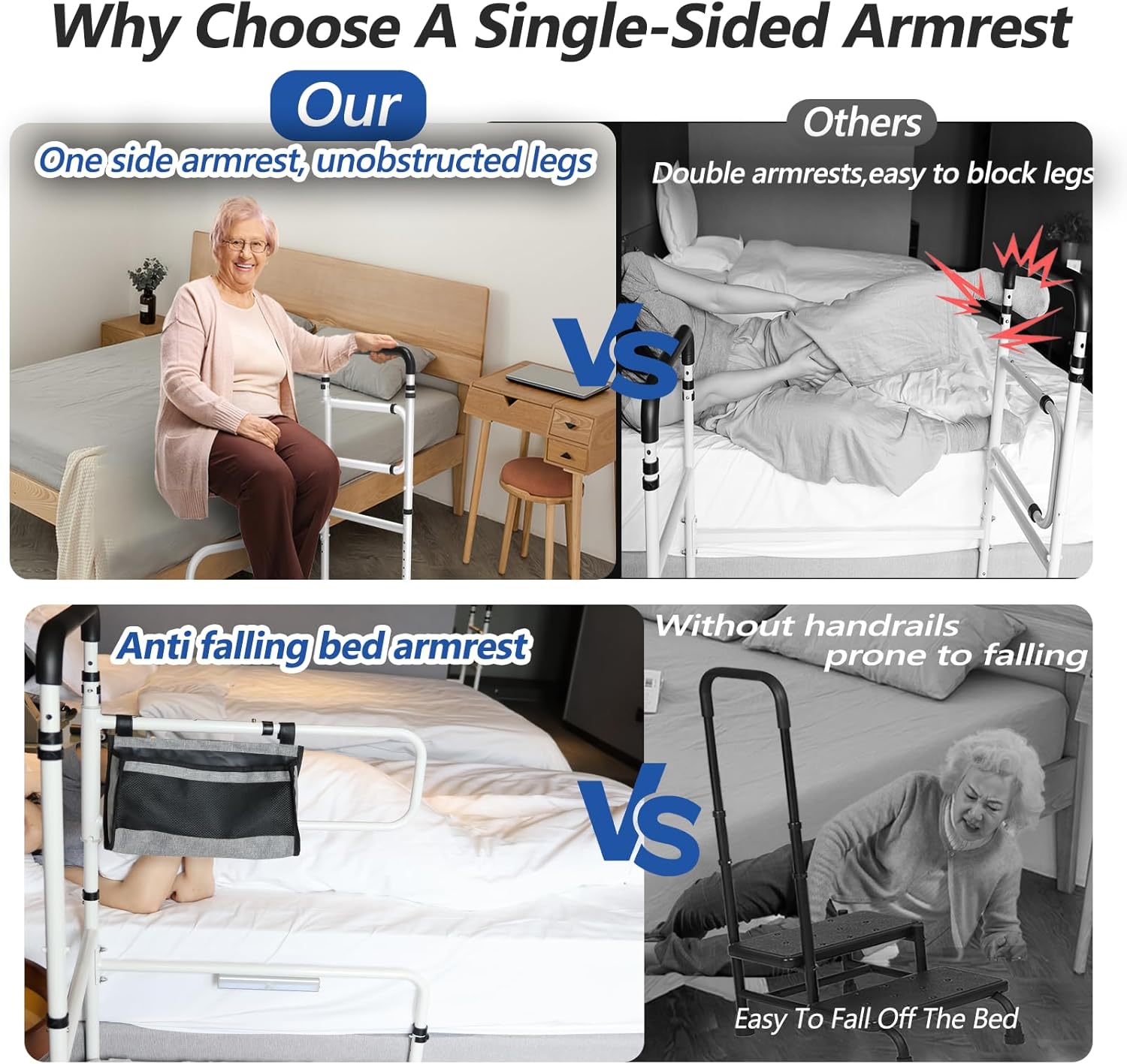Why choose usWe have conducted multiple surveys and found that the single-sided armrest fully meets your needs. When getting out of bed, the double-sided armrest may block your foot space and require you to cross over the armrest, increasing the probability of falling. The single-sided armrest occupies less space, allowing you more space to move around