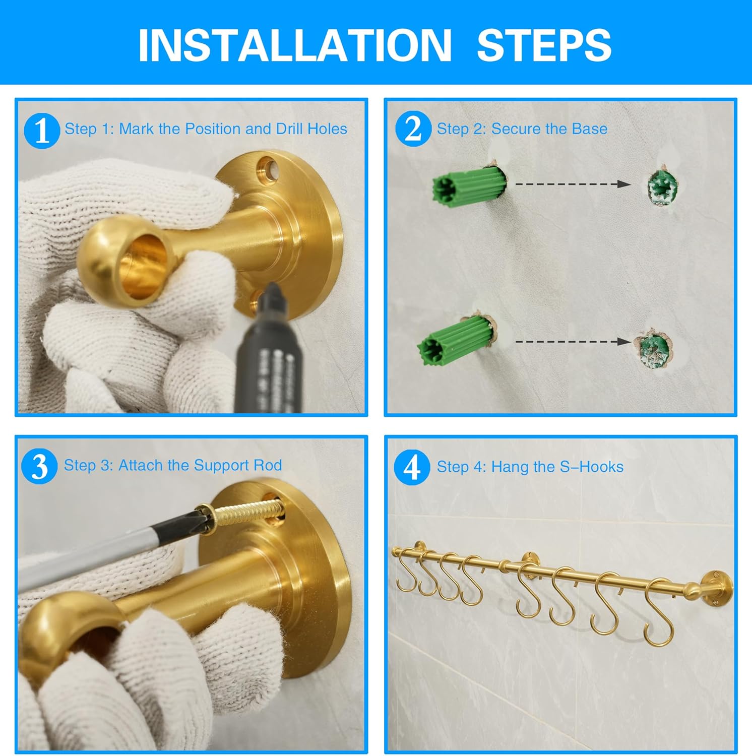 EASY INSTALLATION – We provide a installation kit, including 8 expansion anchors and 8 screws. With the help of basic tools for drilling and securing the screws, you can quickly and effortlessly install this pots and pans hanging rack on your wall.