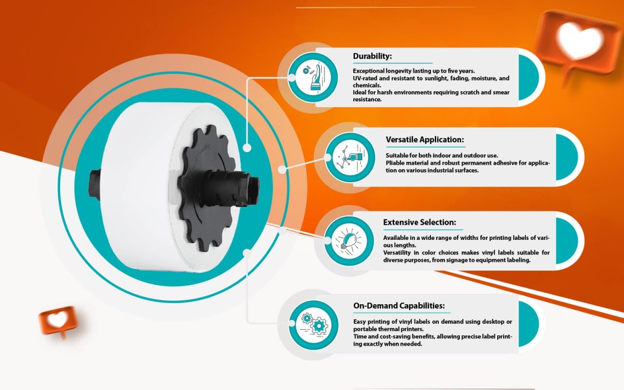 Industrial grade permanent adhesive. Adhesive: The VNMWT-3508 White Vinyl Tape is equipped with a strong and durable adhesive. It adheres well to a variety of surfaces, including metal, plastic, paper, and more, ensuring that your labels stay securely in place. Whether you need labels for temporary or long-term applications, this tape can handle the job.