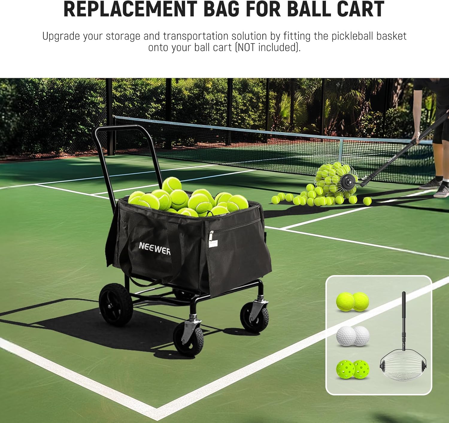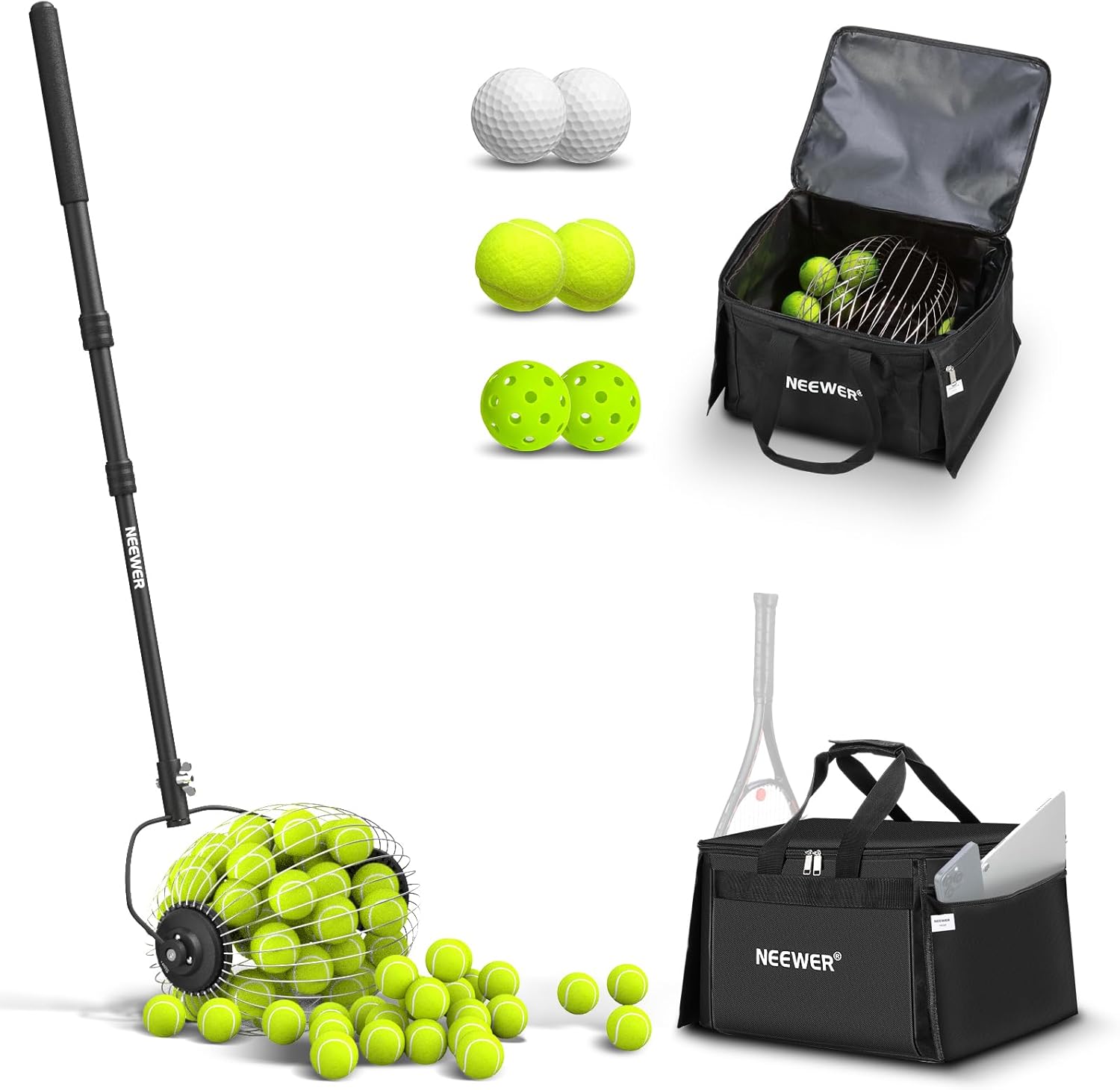 Effortless Ball Collection & Storage The NEEWER TB01S telescopic ball roller and TB01B tennis ball hopper set are designed for quick and efficient ball collection. The rolling picker effortlessly gathers balls on grass, clay, hardwood, and other surfaces without the need to bend. The tennis ball bag can hold and transport up to 110 balls, ideal for practice sessions, tournaments, or casual play of tennis, pickleball, and golf enthusiasts