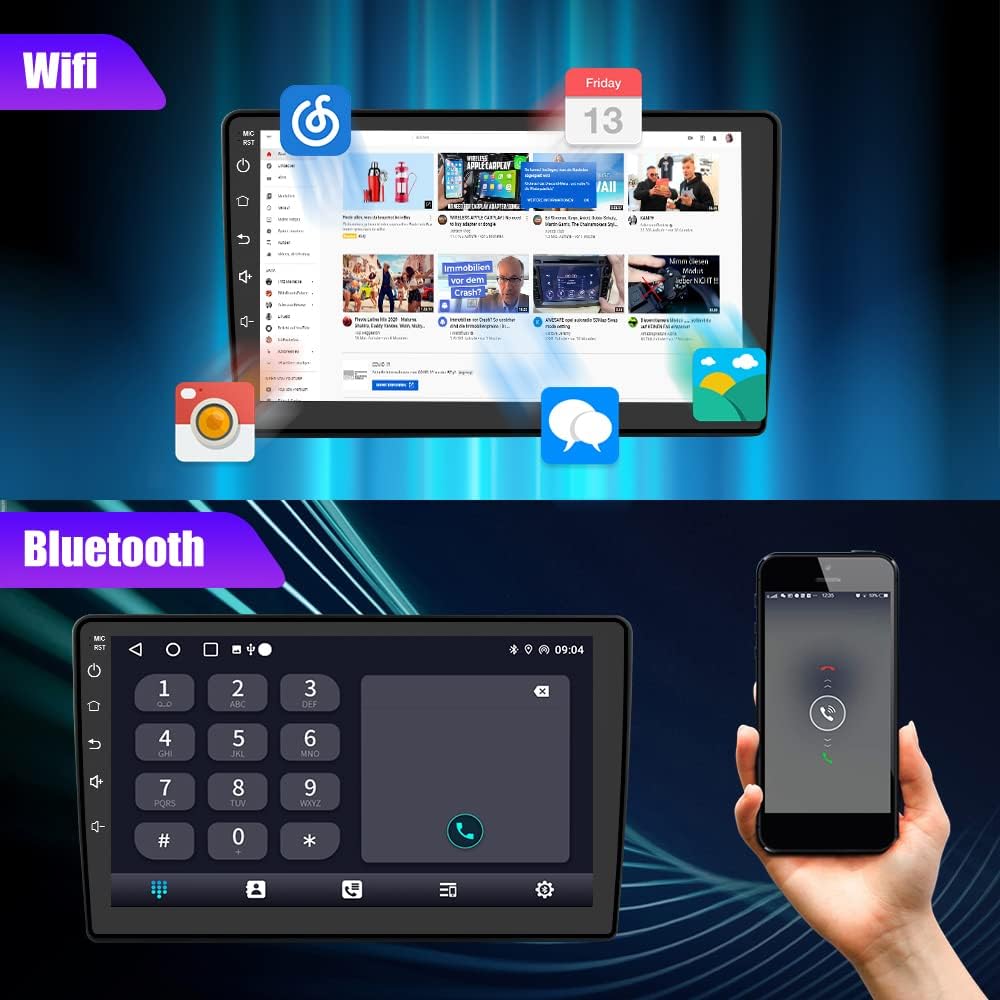 Built-in Wireless CarPlay & Android AutoA Smart Way to Use Your Phone in the Car, Simply connect your iPhone/Android phone to the Android car radio via bluetooth. Use smart voice assistant or touch the display, you can get directions, make calls, send and receive messages, and enjoy music etc. A smarter, safer and more fun way to use your phone in the car, and keep you stay focused, connected and entertained.