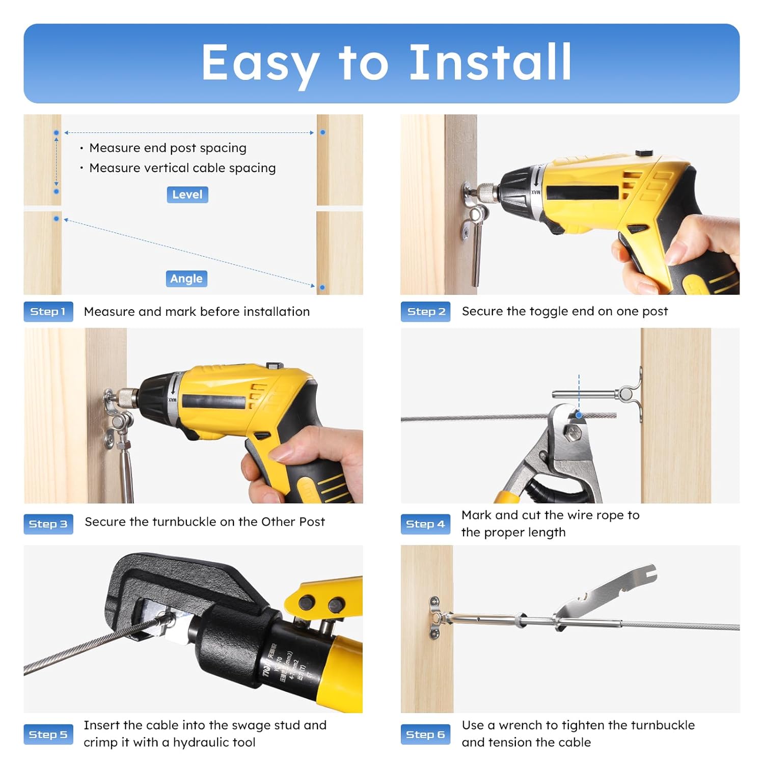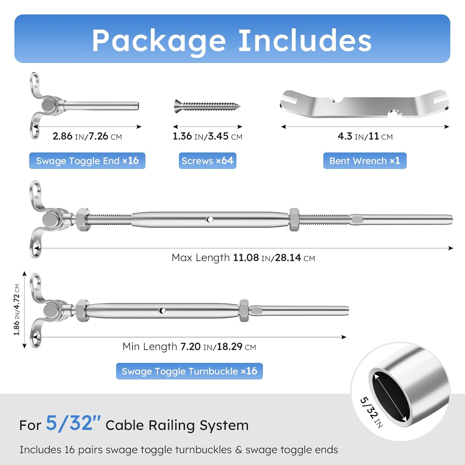 Complete Installation-Ready Package: This all-inclusive cable railing kit contains 16 toggle turnbuckles, 16 toggle ends, 64 corrosion-resistant screws, and a multi-tool spanner. Streamline your DIY project with perfectly matched components for rail posts up to 6\' wide