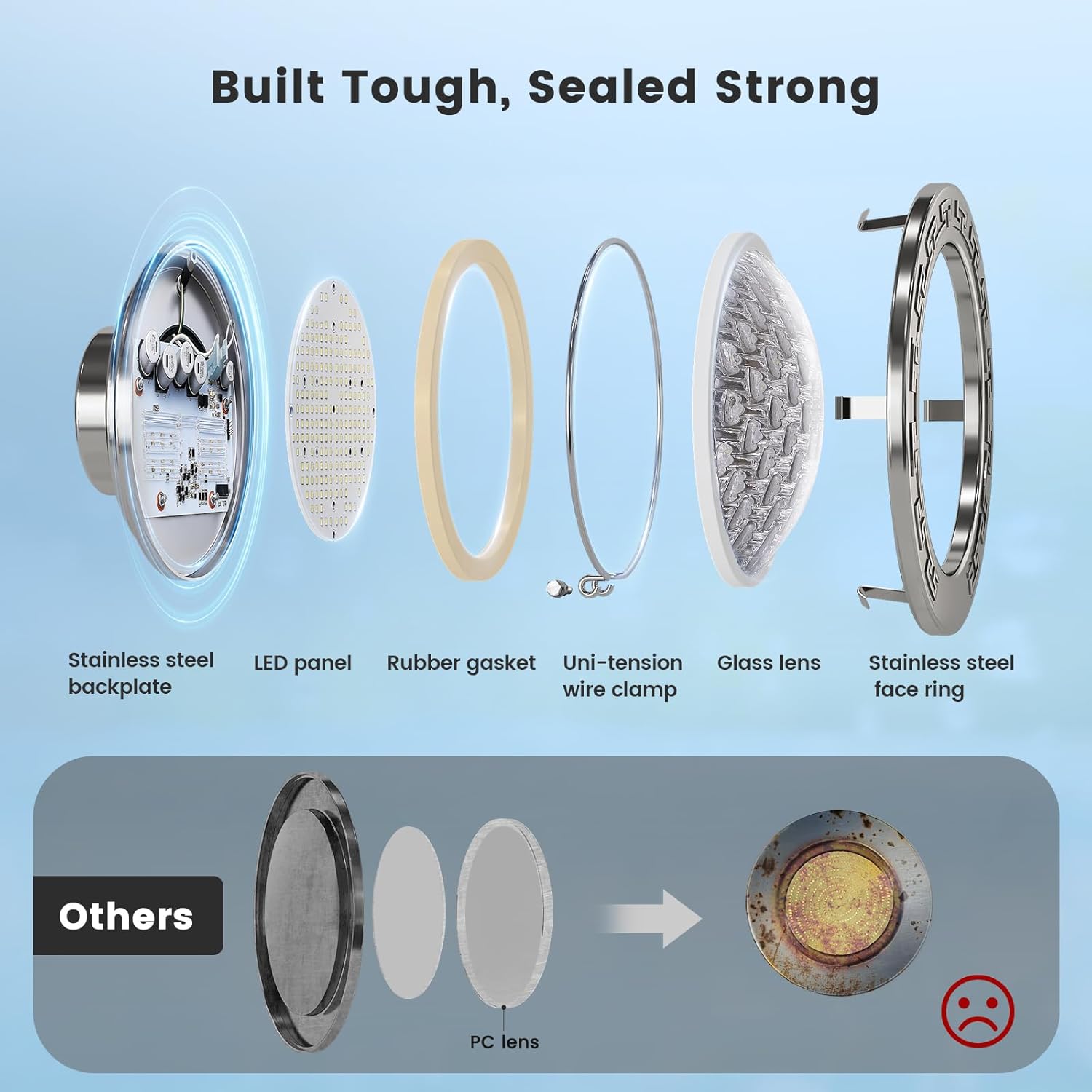 Waterproof & Durable for All Seasons: Built with IP68 waterproof sealing and a 316L stainless steel faceplate, this inground pool light is tough enough for year-round underwater use. It resists corrosion, cracking, and fading—perfect for long-term pool lighting peace of mind