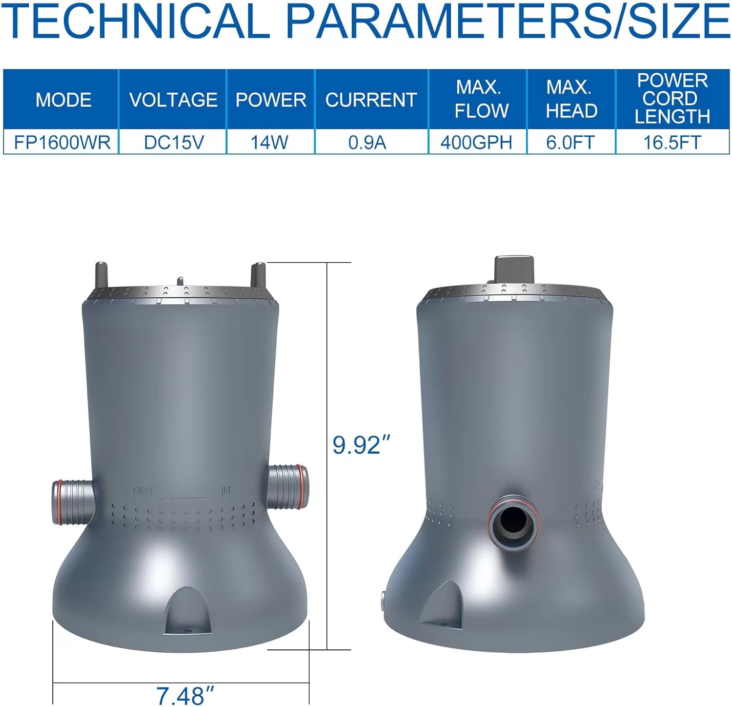 Dual-Power Operation (Solar/AC) & Low-Voltage Safety 12W DC15V system ensures safe usage; switch to plug-in mode (adapter included) for 24/7 filtration in all weather conditions.