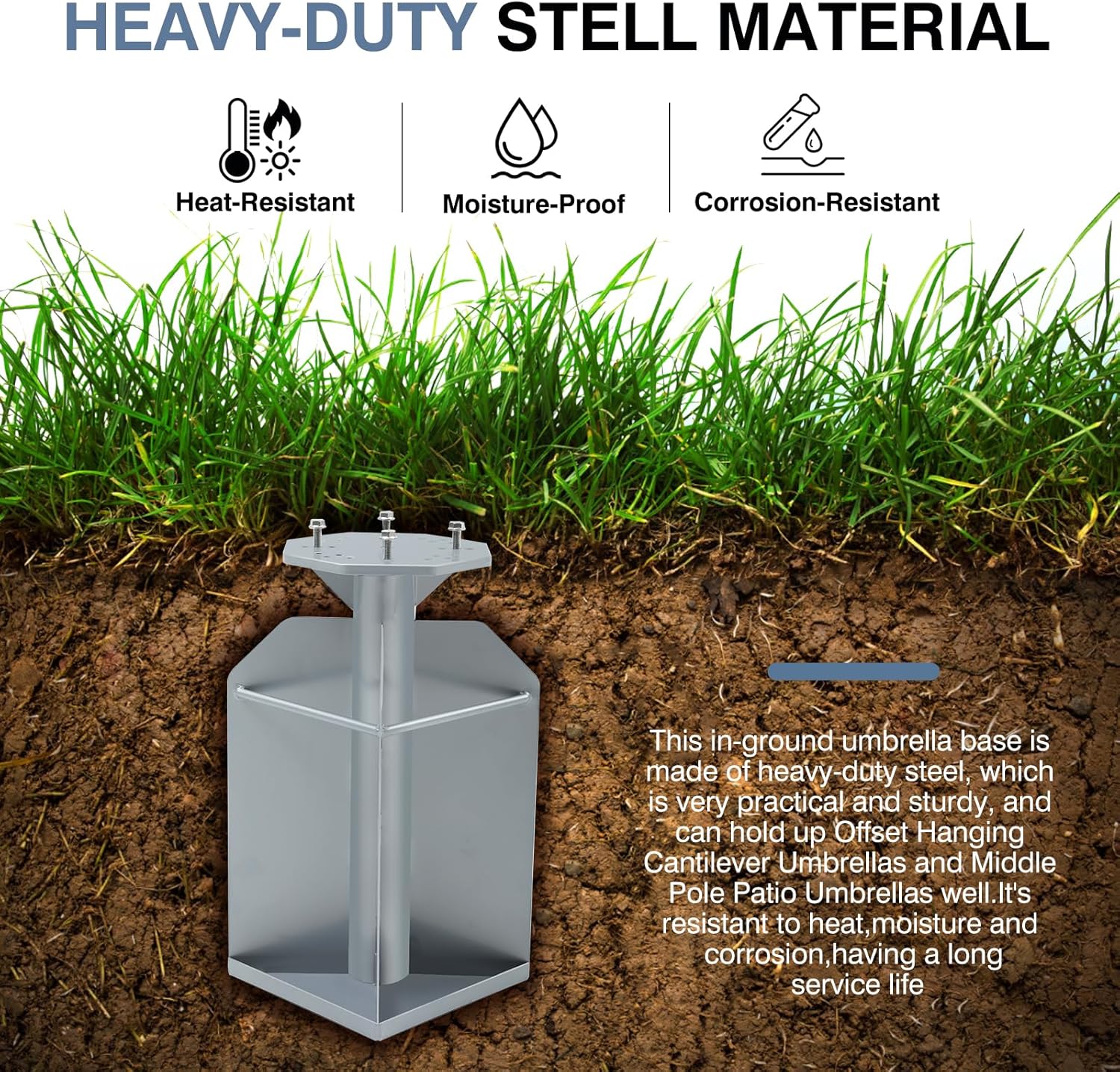 Robust and Durable:Heavy-Duty In-Ground Umbrella Base is a sturdy, rustproof, and space-saving solution for outdoor patio, cantilever, and middle-pole umbrellas. Designed for in-ground installation, this steel anchor provides exceptional stability and durability, making it suitable for both residential and commercial use.