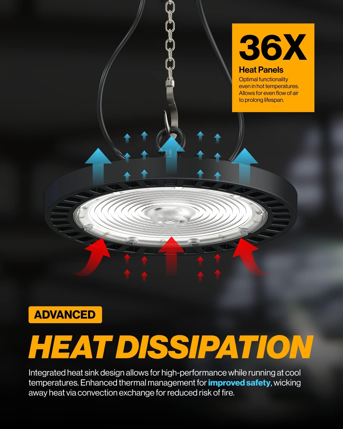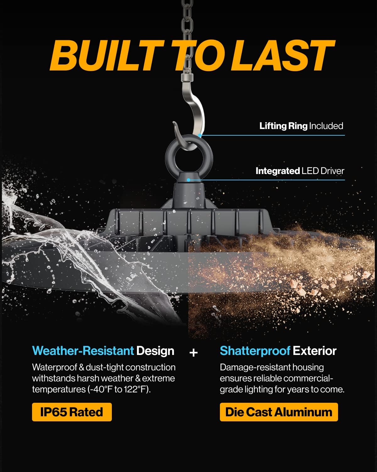 COMMERCIAL-GRADE - With its shatter-resistant aluminum housing, our UFO High Bays replace outdated HID fixtures with resilient & durable illumination. IP65 waterproof rating ensures reliable, bright light in any weather. UL & DLC certified.