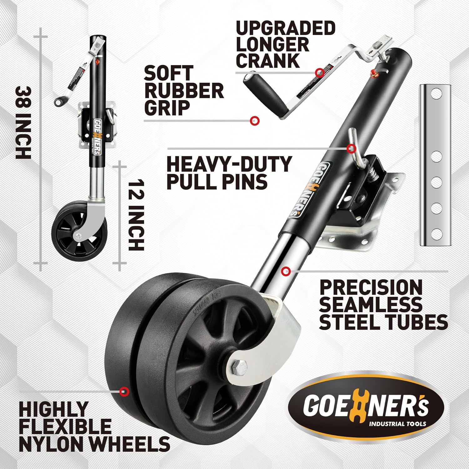 2000LBS Strength. Built for Extreme LoadsCrafted from precision seamless steel tubing, GOEHNER`S trailer jack delivers 2000lbs of certified load strength. Designed for heavy-duty marine and utility trailers, it ensures maximum structural integrity even under the harshest towing conditions.