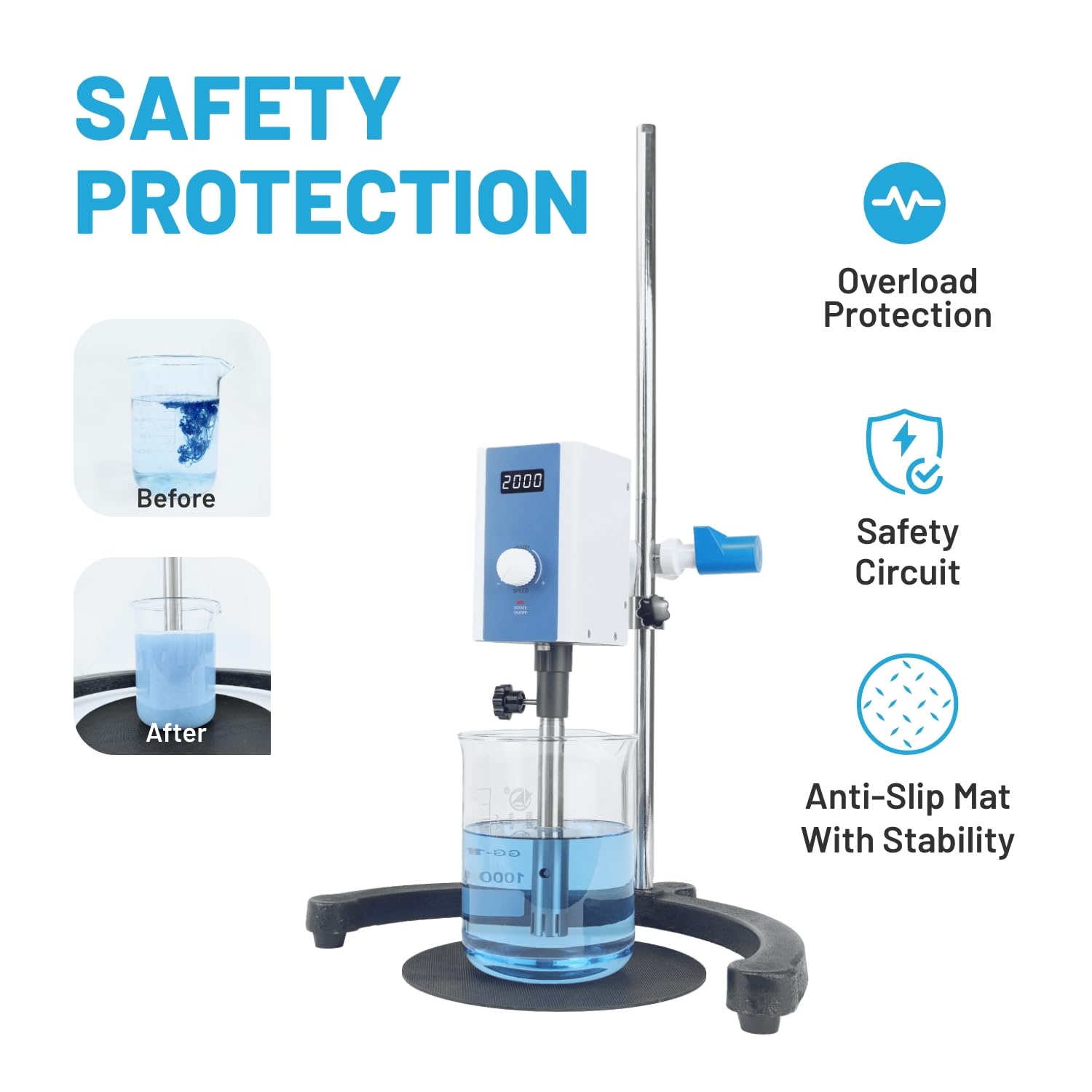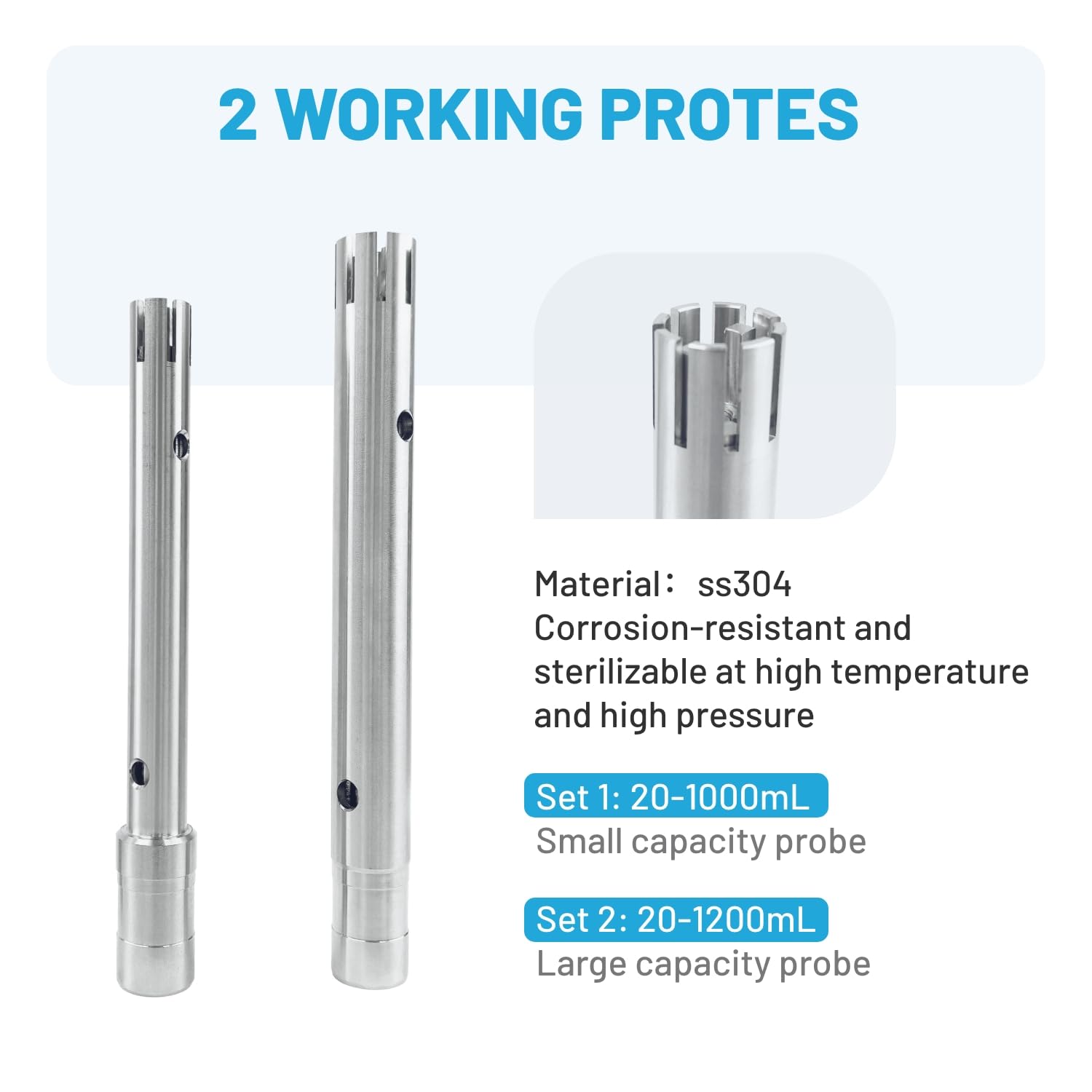 Two Stirring heads Included: Large capacity head -diameter 18mm,length 160mm,processing capacity: 20-1200mL; Small capacity head -diameter 12mm,length 150mm,processing capacity: 20-1000mL ; Stainless steel material, not easy to corrode, high stirring efficiency, multi-configuration stator expands the application range