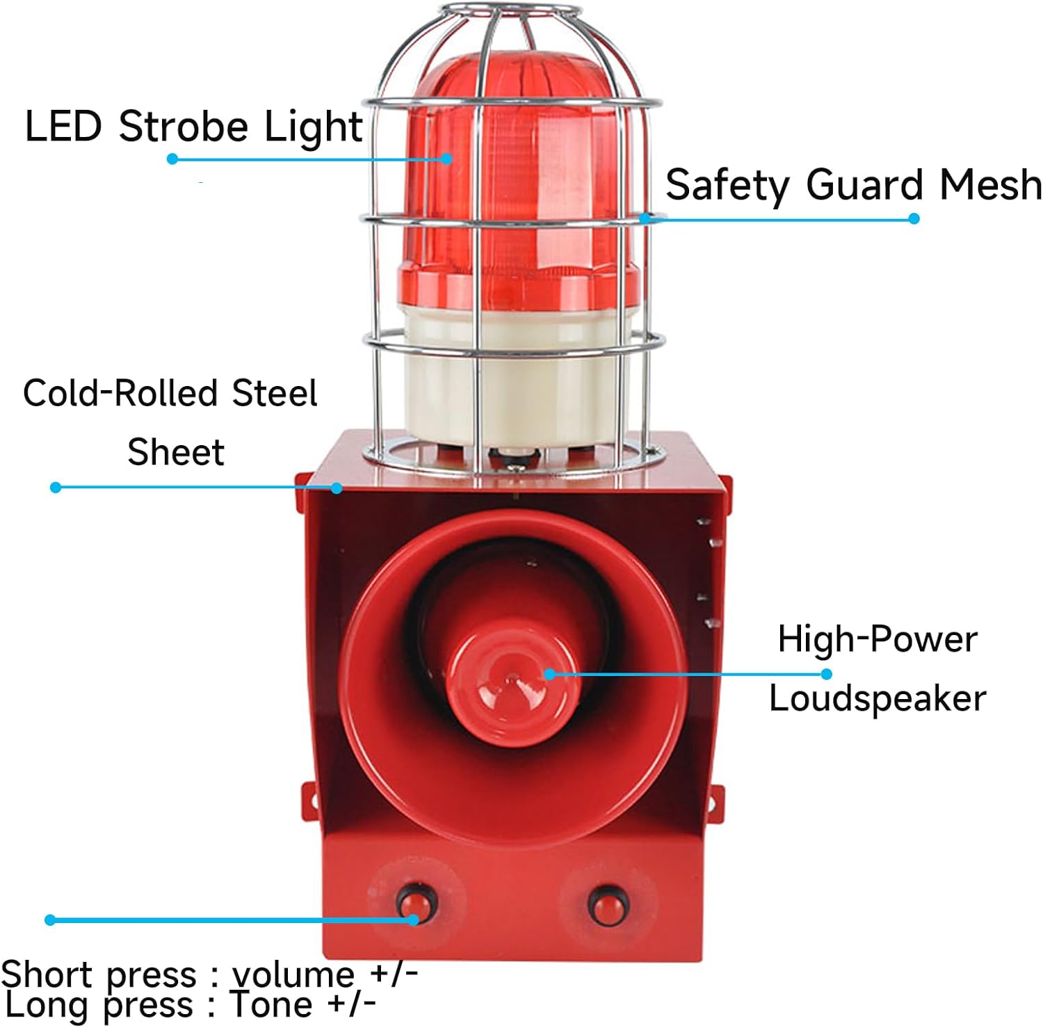 130dB alarm sound: Equipped with an arc-shaped horn, delivering a powerful 130dB alarm sound. Support volume adjustment button, according to the needs of the scene to freely control loudness