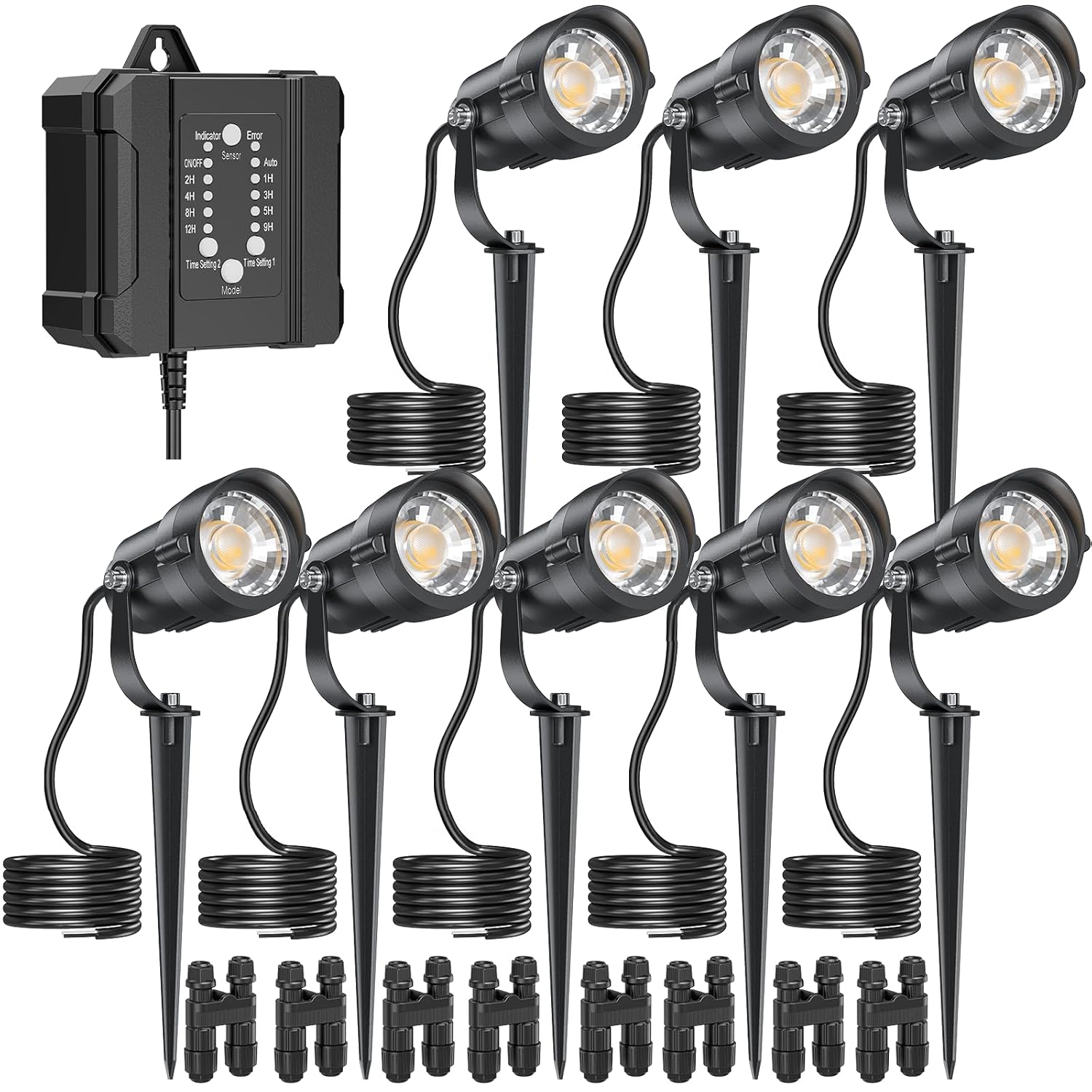 LOW VOLTAGE LANDSCAPE LIGHTING KIT - This low voltage landscape lighting kit includes 8 LED landscape spotlights, 100W low voltage landscape transformer with photocell sensor and timer, waterproof wire connectors*8. The perfect outdoor landscape lights package, all at a great package price!