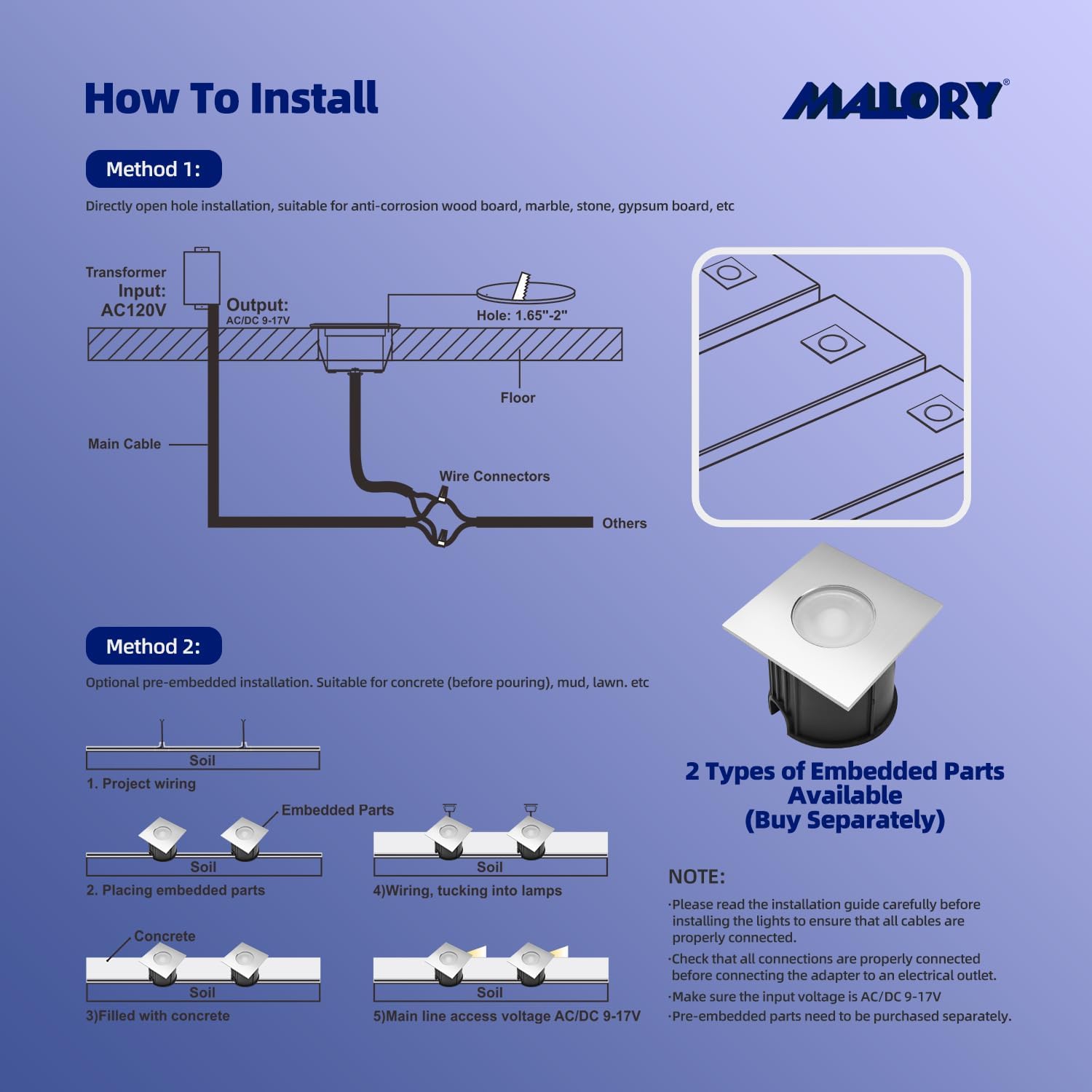 IP67 Waterproof & ETL Listed Light Wire -- This low voltage deck lighting comes with a ETL Listed light wire and two waterproof wire connector, easy to connect to existing systems. IP67 waterproof rating and -49113 working temperture,without worrying about rain, snow, frost, high temperature, and other bad weather. This LED Deck light works with 9-17V AC/DC(Low voltage transformer not included)